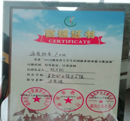 近日,由湖南省人力资源和社会保障厅、省教育厅、共青团湖南审委主办,省人力资源服务中心、人才就业社保信息报社承办的“2018年湖南省大学生社团就业创业能力挑战赛”传来喜讯,我校读者协会获评“湖南省百强社团”荣誉称号。据了解,本次大赛全省共有760余个大学生社团进入初赛,吸引了近20万大学生实名注册报名参加。
