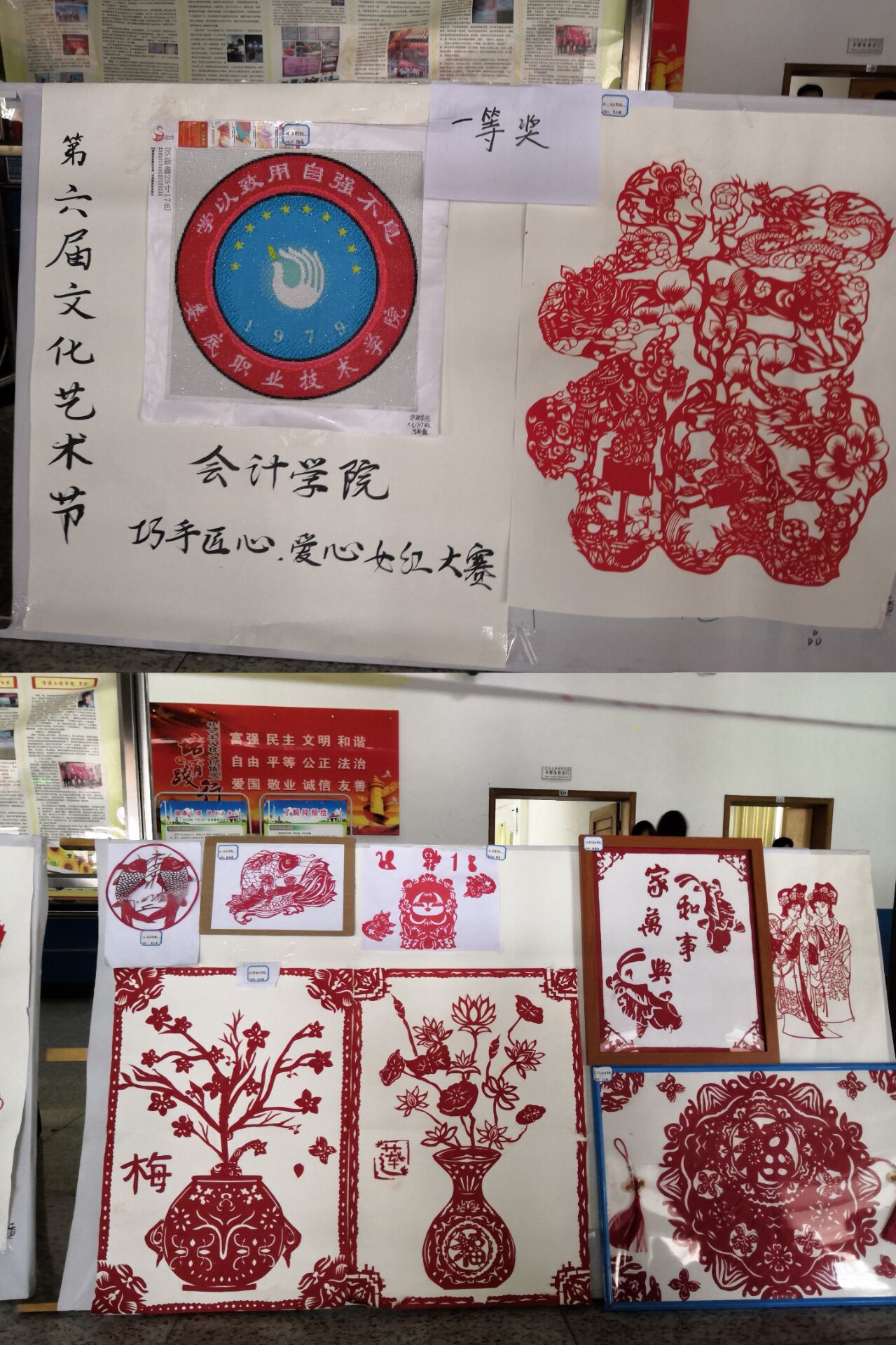 为期15天的手工艺作品共收到了80副作品。11月6日,获奖的33副作品在我校主教楼一楼大厅展出,手工作品全部为学生亲手设计制作,有剪纸、钻石绣、十字绣、编织等多种形式的手工艺品。精美的手工艺作品吸引了师生参观,并获得大家的一致好评。