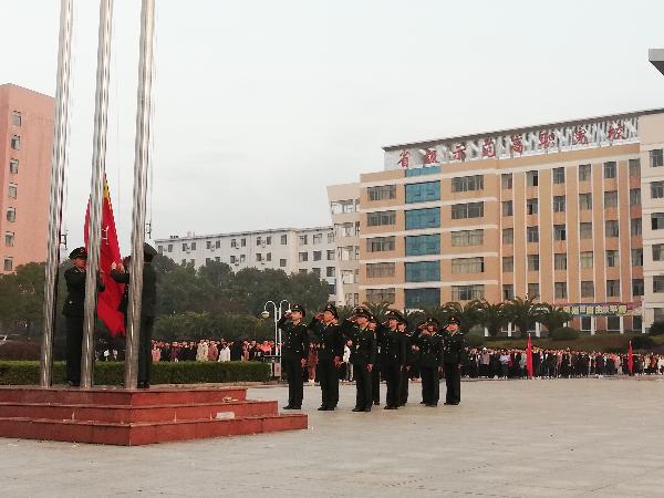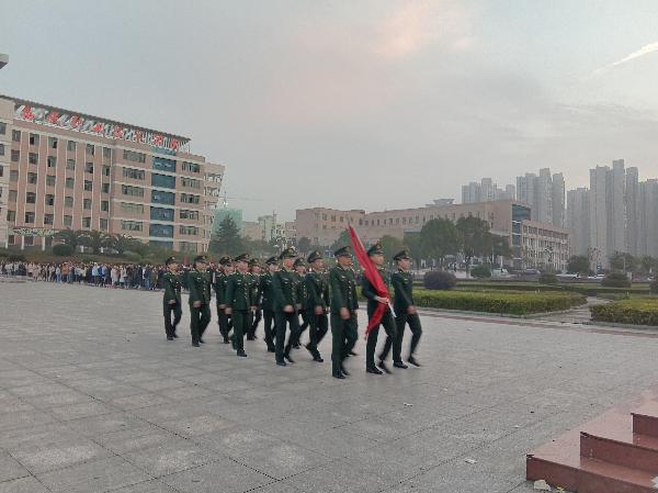 伴随着进场音乐的结束,升旗仪式正式开始。迎着朝阳,国旗班成员迈着铿锵的步伐来到了国旗台下,全场一片肃静。在激昂的《义勇军进行曲》中,升旗手振臂一挥,鲜艳的五星红旗徐徐展开,在初升的阳光映照下、全体师生的注目中,迎着初升的太阳,在晨曦中迎风飘扬在娄职的上空。