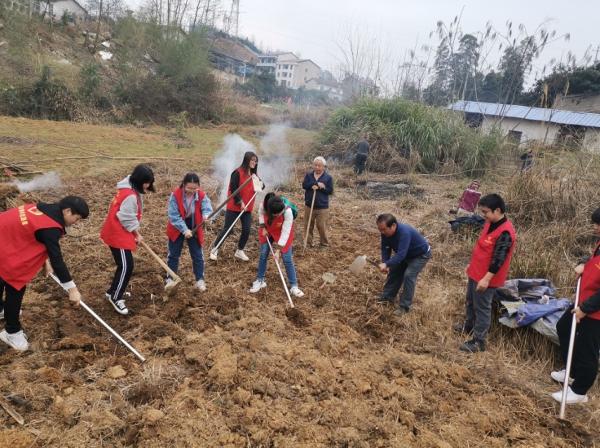 志愿者与当地老人一起种植蔬果