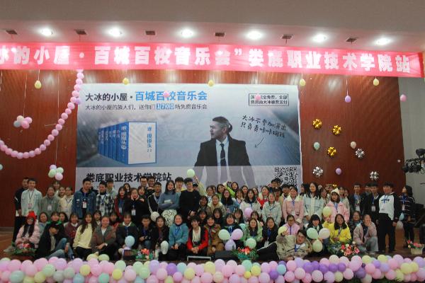 为了丰富校园文化生活,提升我校学生兴趣爱好,促进学生全面发展,展示学生爱国、爱校,积极向上的精神风貌,营造有利于大学生健康成长的校园文化气氛,于2019年11月29日晚,由主办方大冰的小屋,承办方娄底职业技术学院团委举办的“大冰的小屋·百城百校音乐会”活动在102新培楼隆重举行,各二级学院代表学生积极参与。