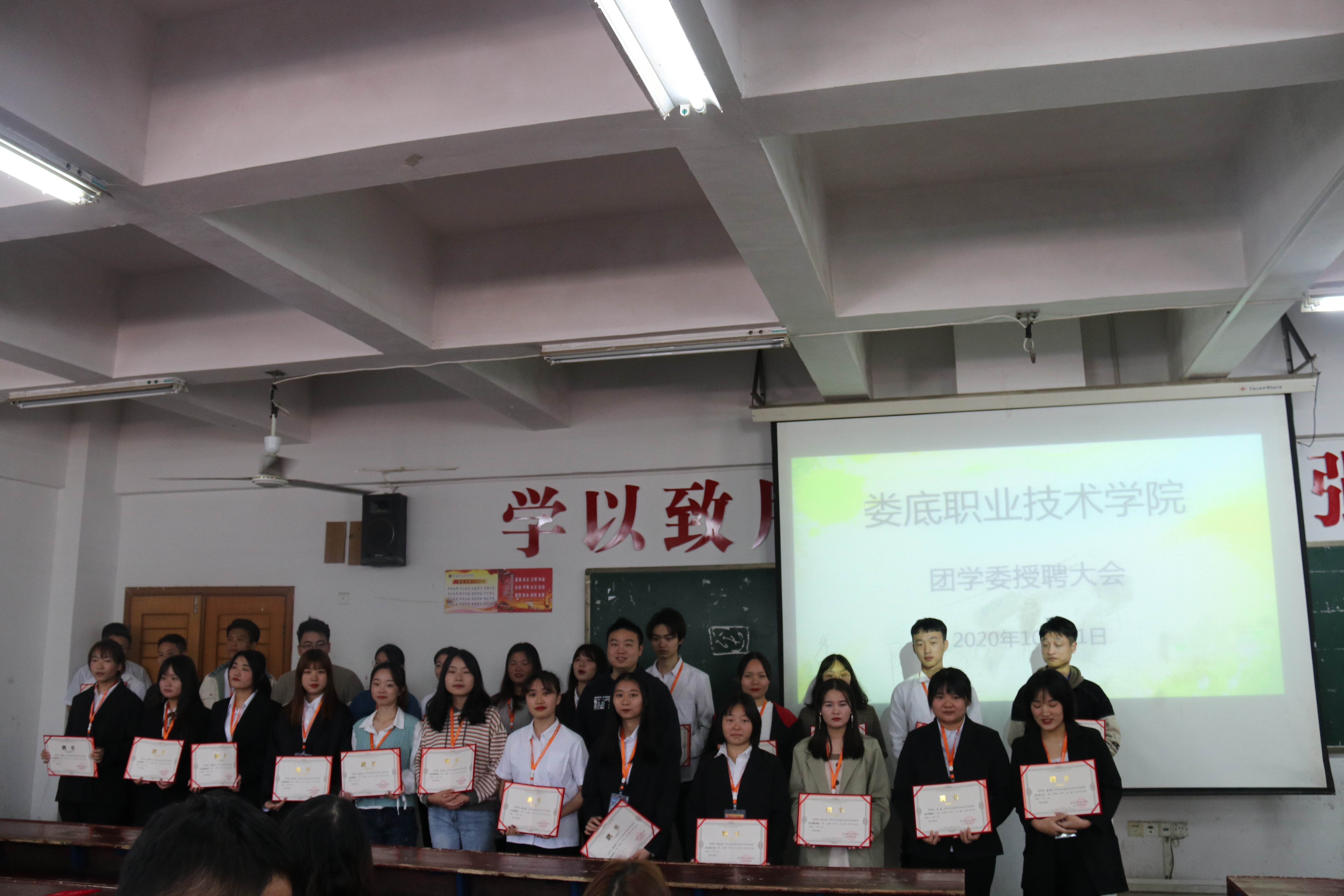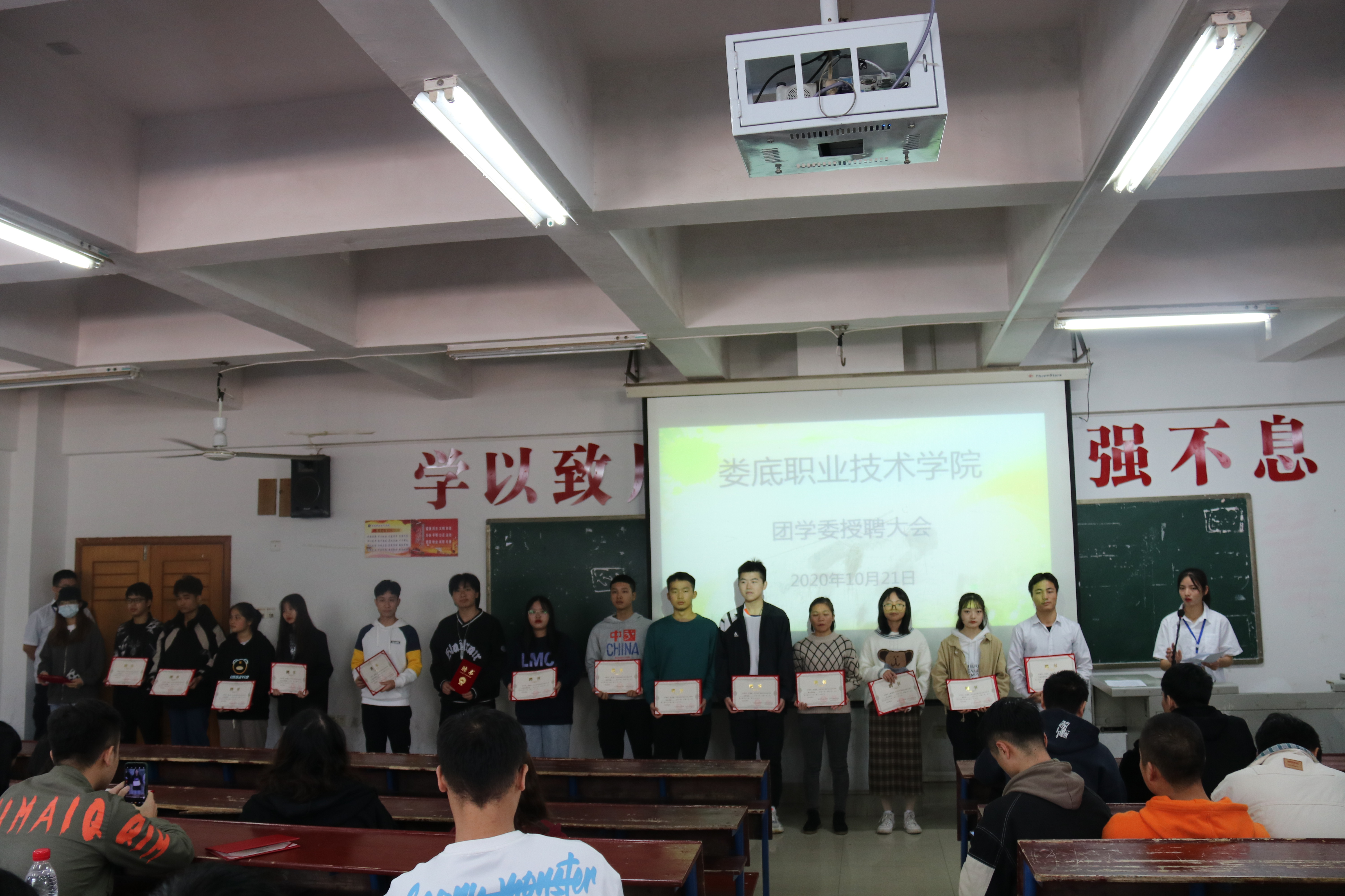 10月21日中午我校团学委授牌仪式在主教楼210室举行,出席本次仪式的有团委指导老师游骏、李景亮,团学委全体干部、各协会会长。本次会议由19社联组织部干部邓志平主持。