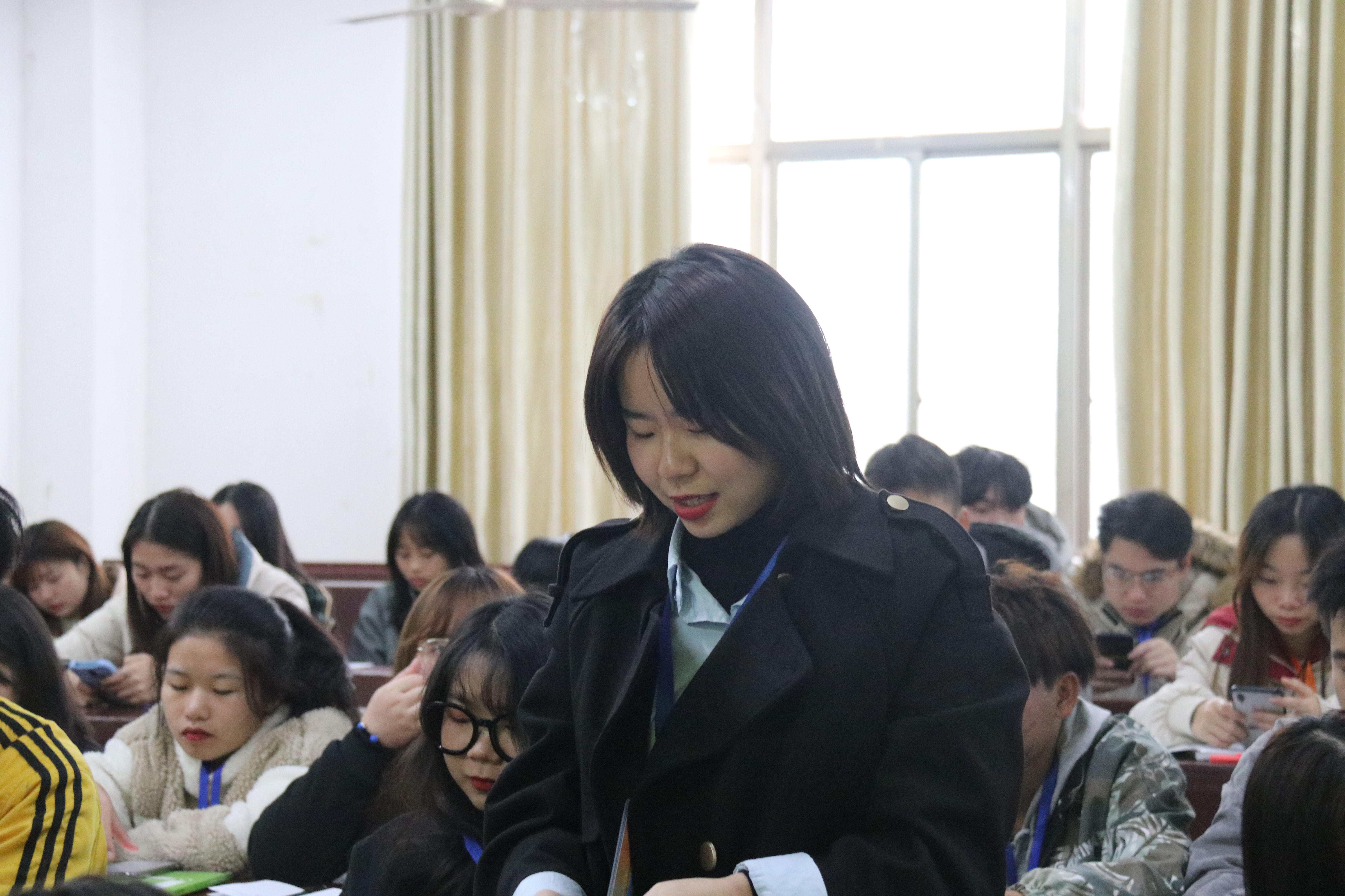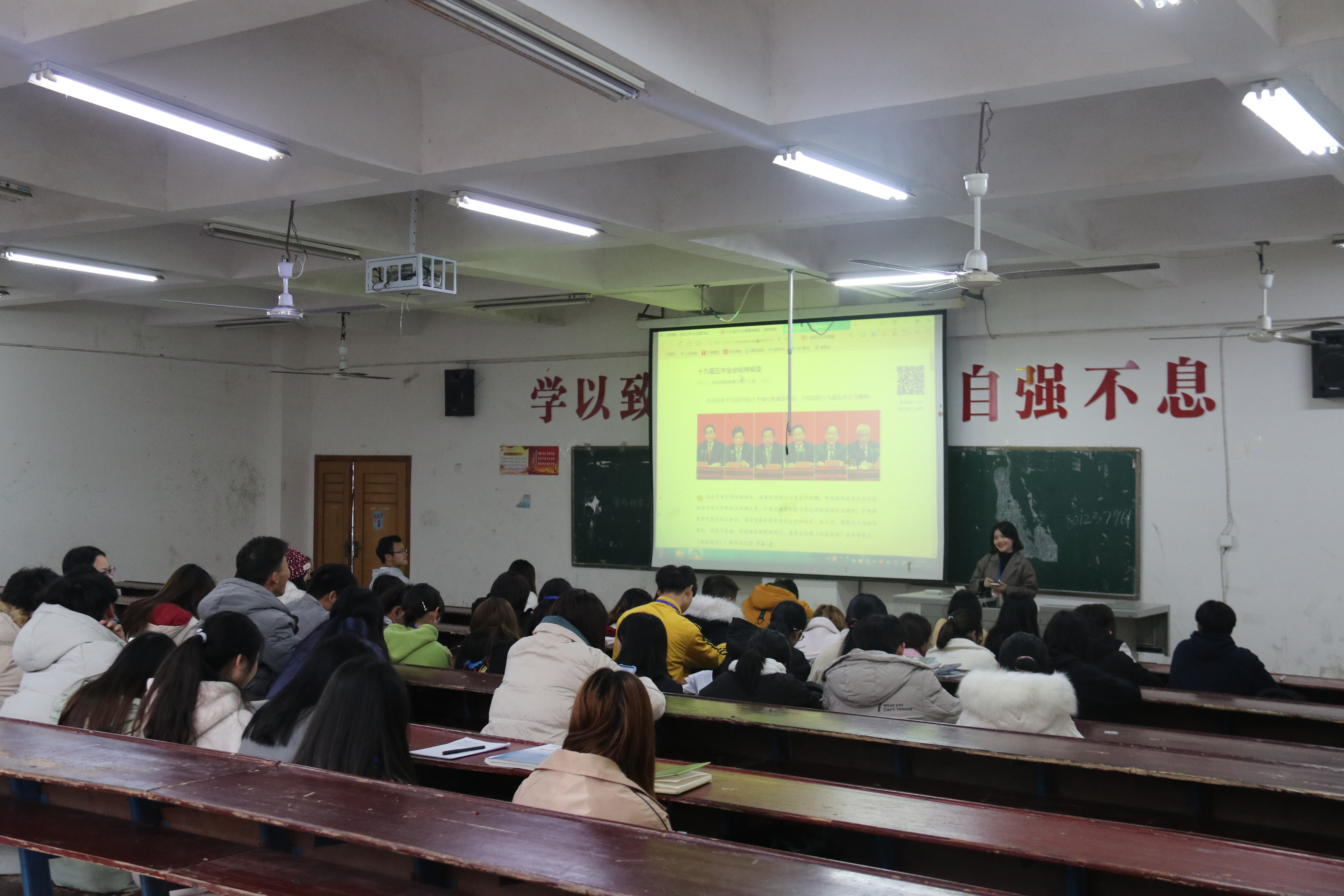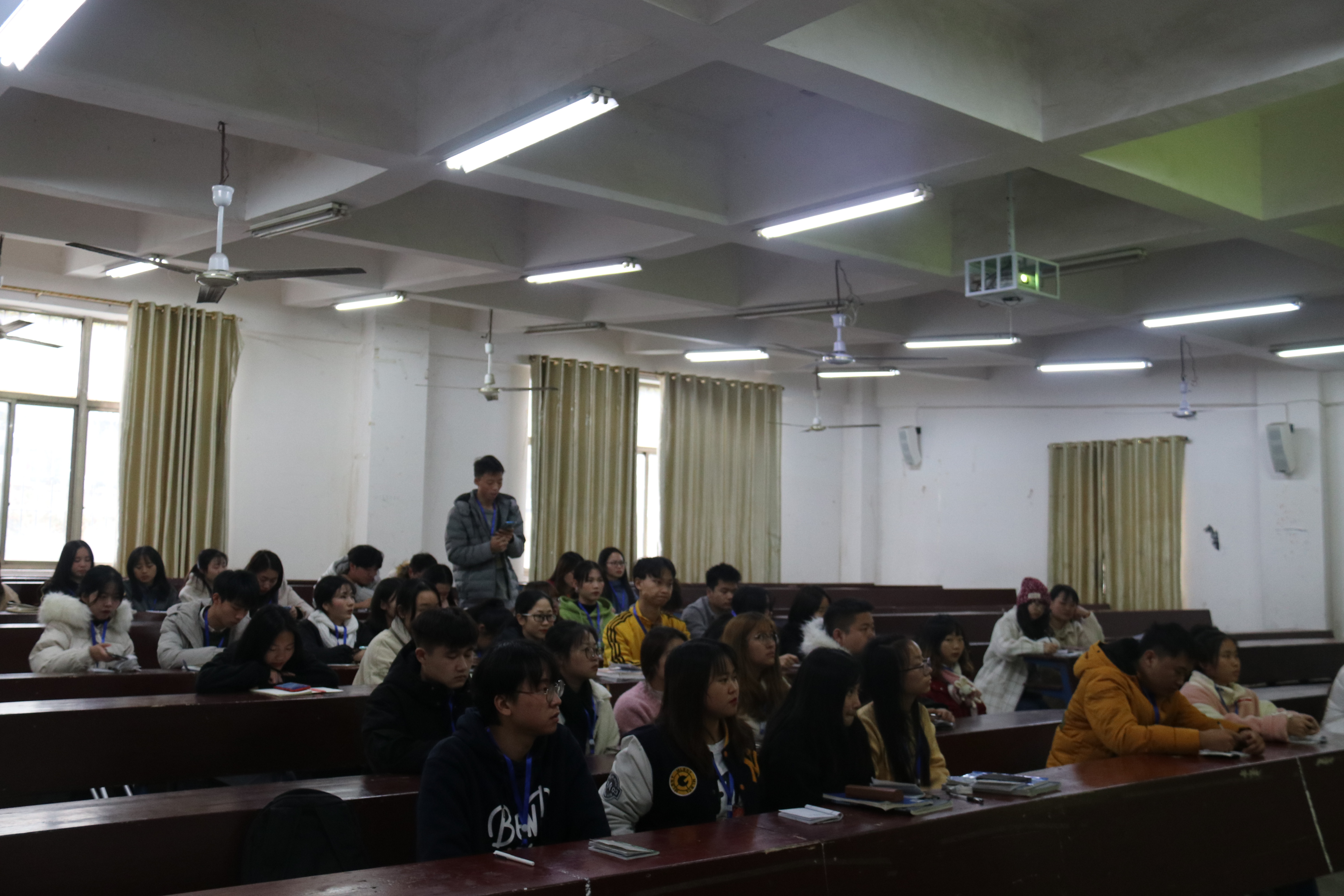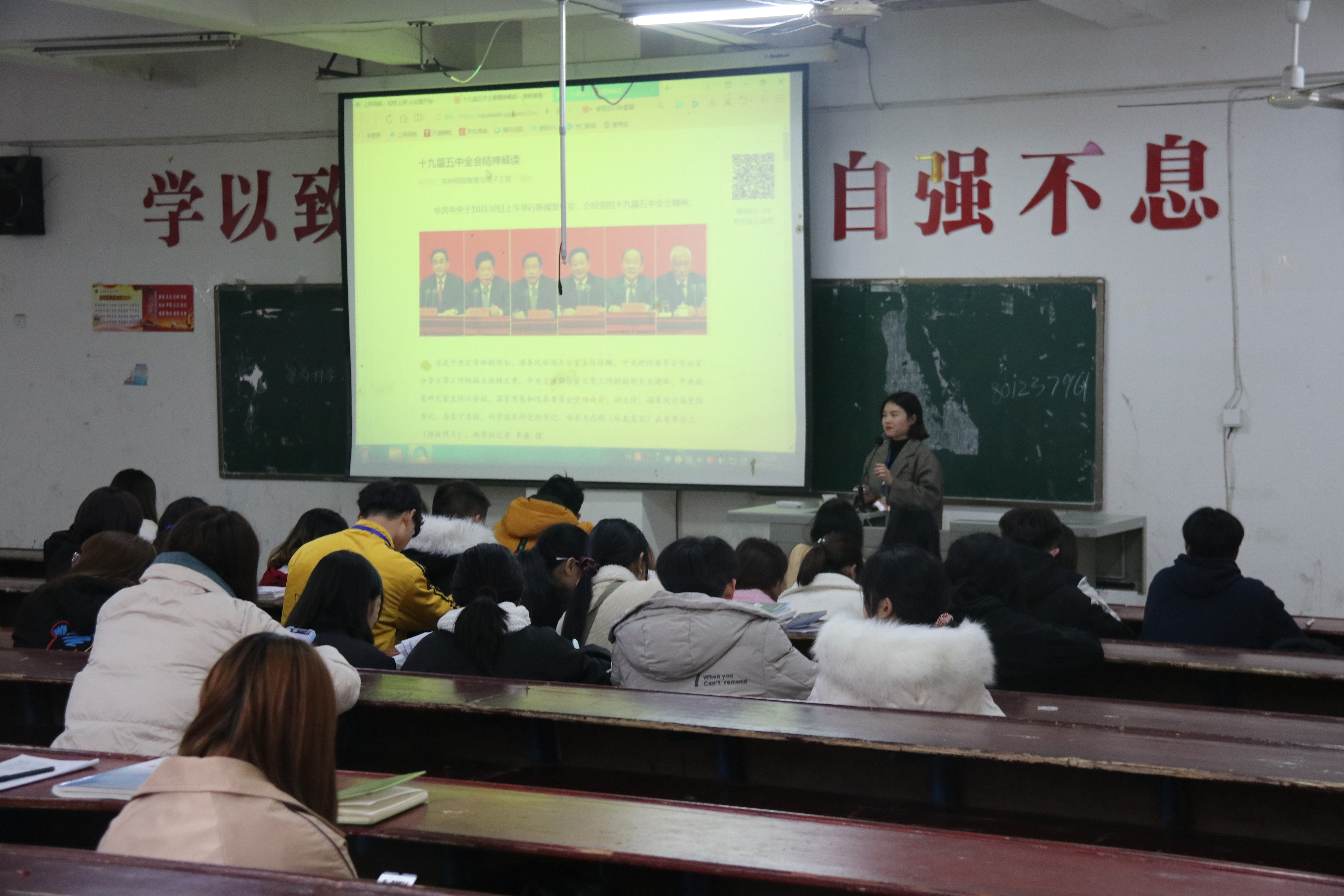 在学生干事谭敏的解读下干事们逐步了解总书记在基层会上的内容:珍惜发展好局面,巩固发展好势头、坚持贯彻以民为中心的发展思想、加强基层党组织和基层政权建设、基层代表要更好发挥带头作用。同时采取一问一答的形式来巩固大家对党的十九届五中全会精神的知识巩固,干事们也积极发言自己的看法。