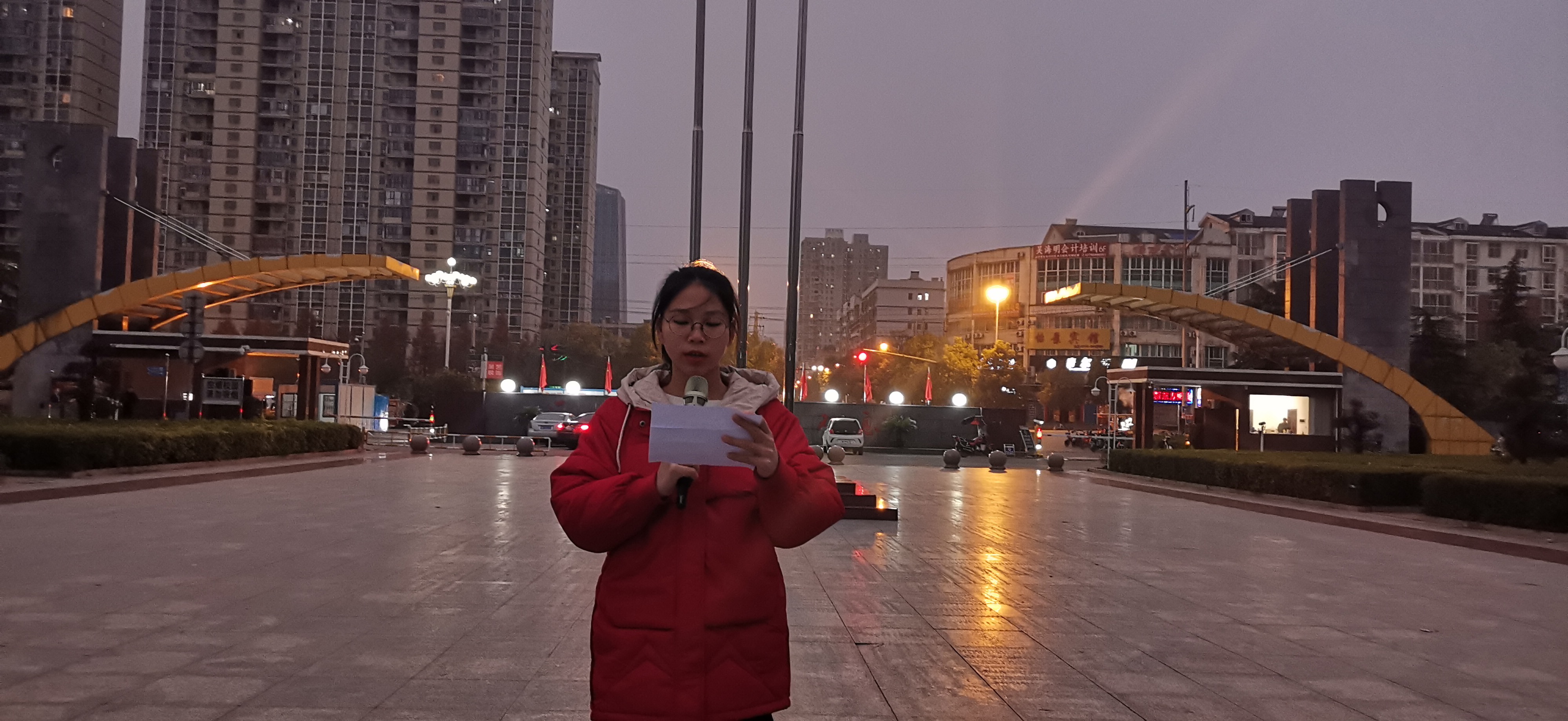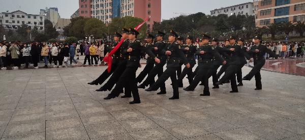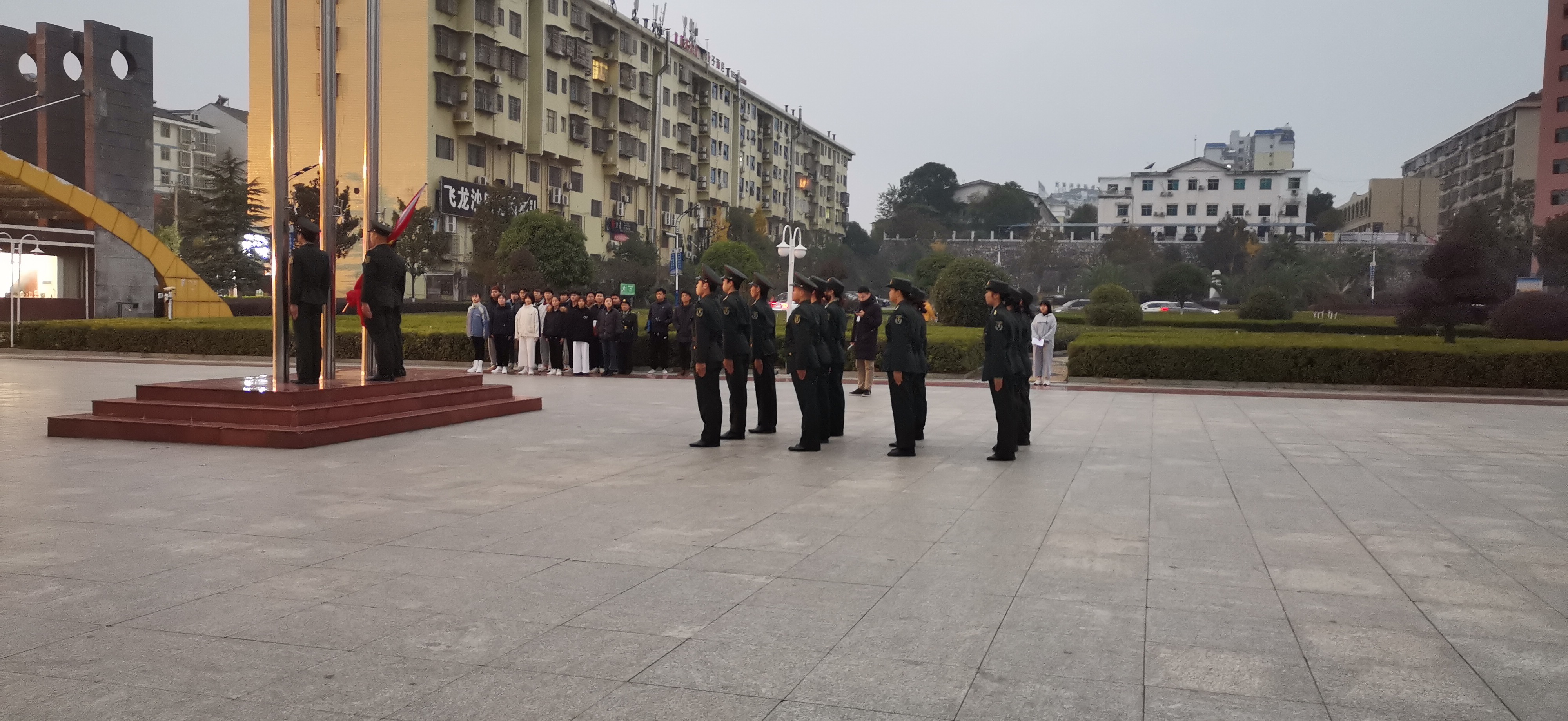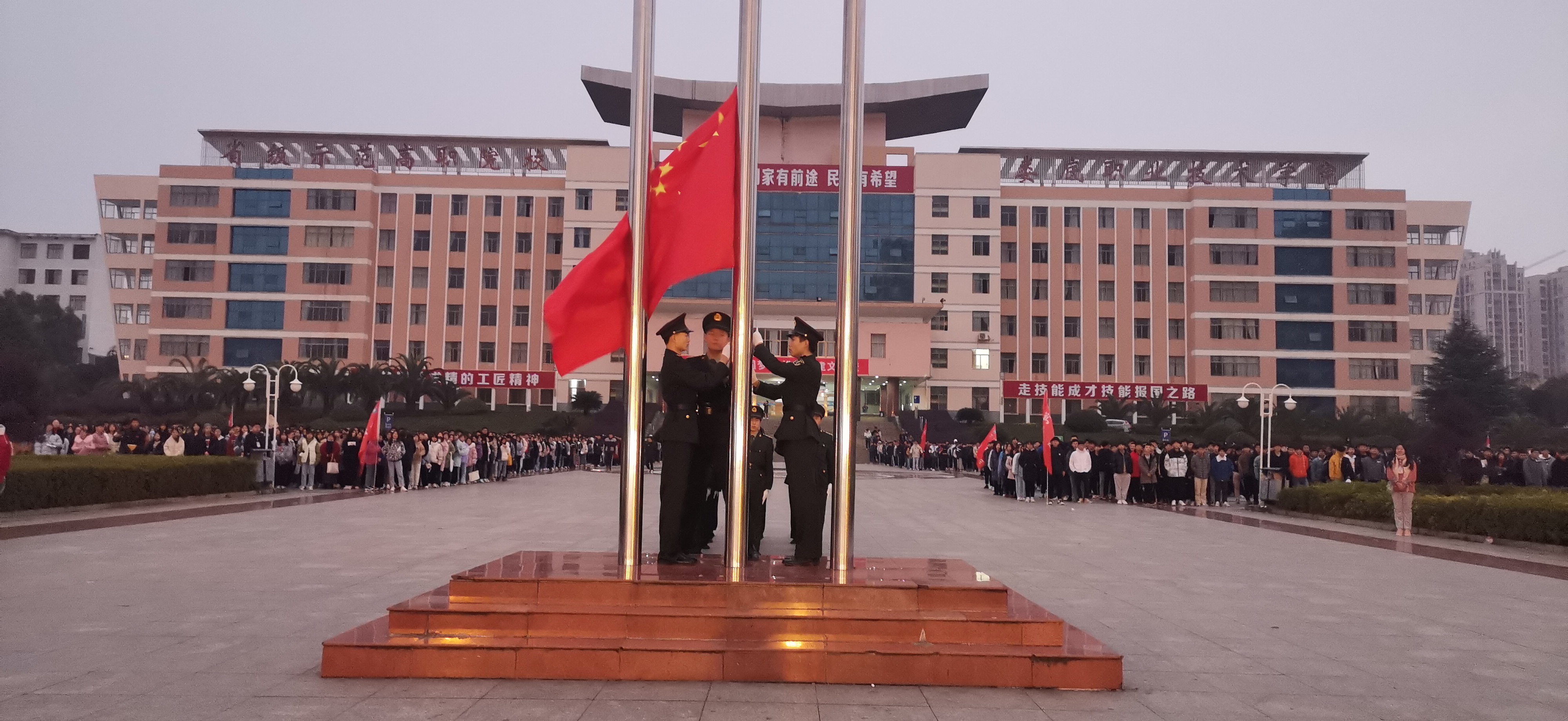 12月7日早晨,为了纪念南京大屠杀82周年,也为了使人们更加铭记历史,太阳还未全部升起,在寒风吹拂之下,娄底职业技术学院全体师生整齐的集合在文化广场上。天也微亮,每周一次的升旗仪式这就开始了。升旗仪式伊始,国旗班迈着整齐的步伐,护送着国旗到达升旗台。在主持人一声“升国旗,奏国歌,全体师生行注目礼”后,国歌紧接着响起,全体师生目送着五星红旗一步步拔升,随着音乐的进行越来越高,直到触顶。