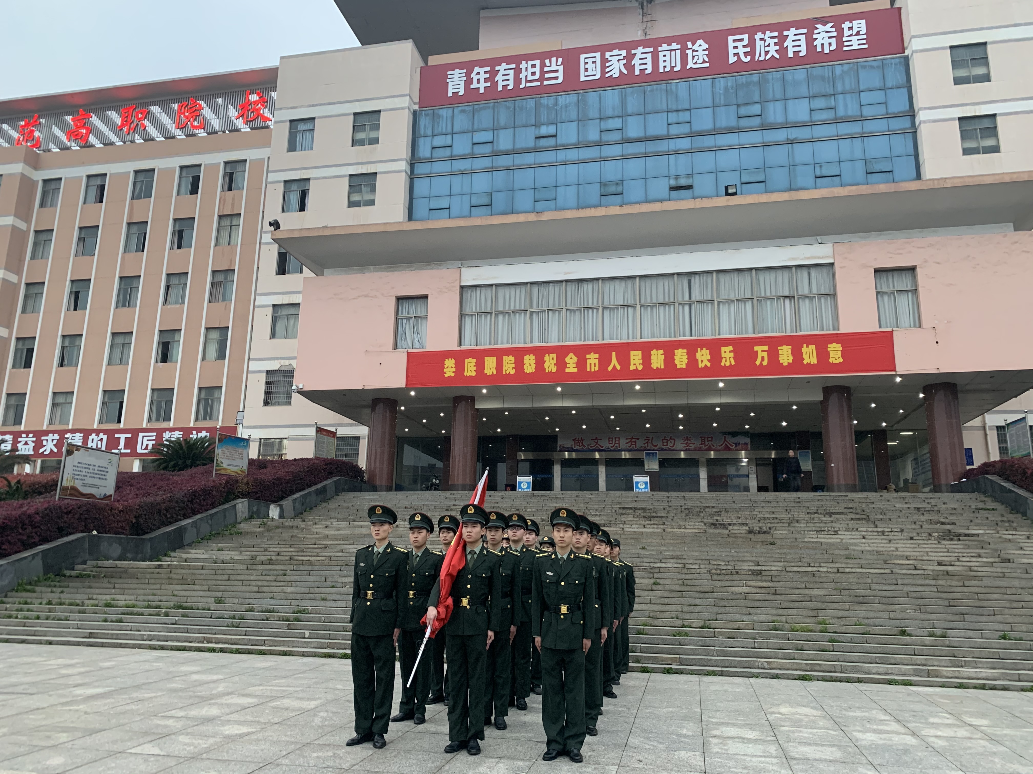 伴随着进场音乐的结束,升旗仪式正式开始。迎着朝阳,国旗班成员迈着铿锵的步伐来到了国旗台下,全场一片肃静。在激昂的《义勇军进行曲》中,升旗手振臂一挥,鲜艳的五星红旗徐徐展开,在初升的阳光映照下、全体师生的注目中,在晨曦中迎风飘扬在娄职的上空。