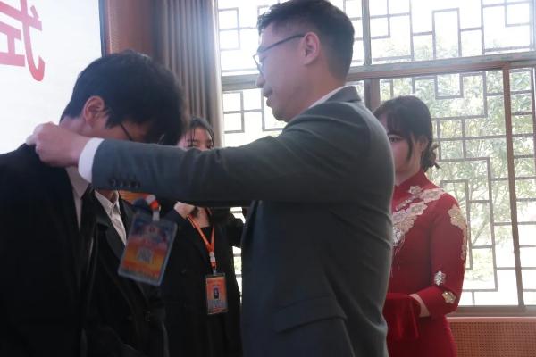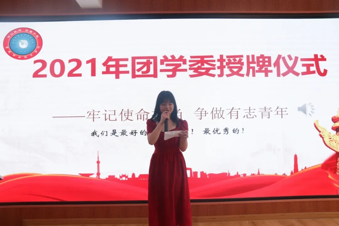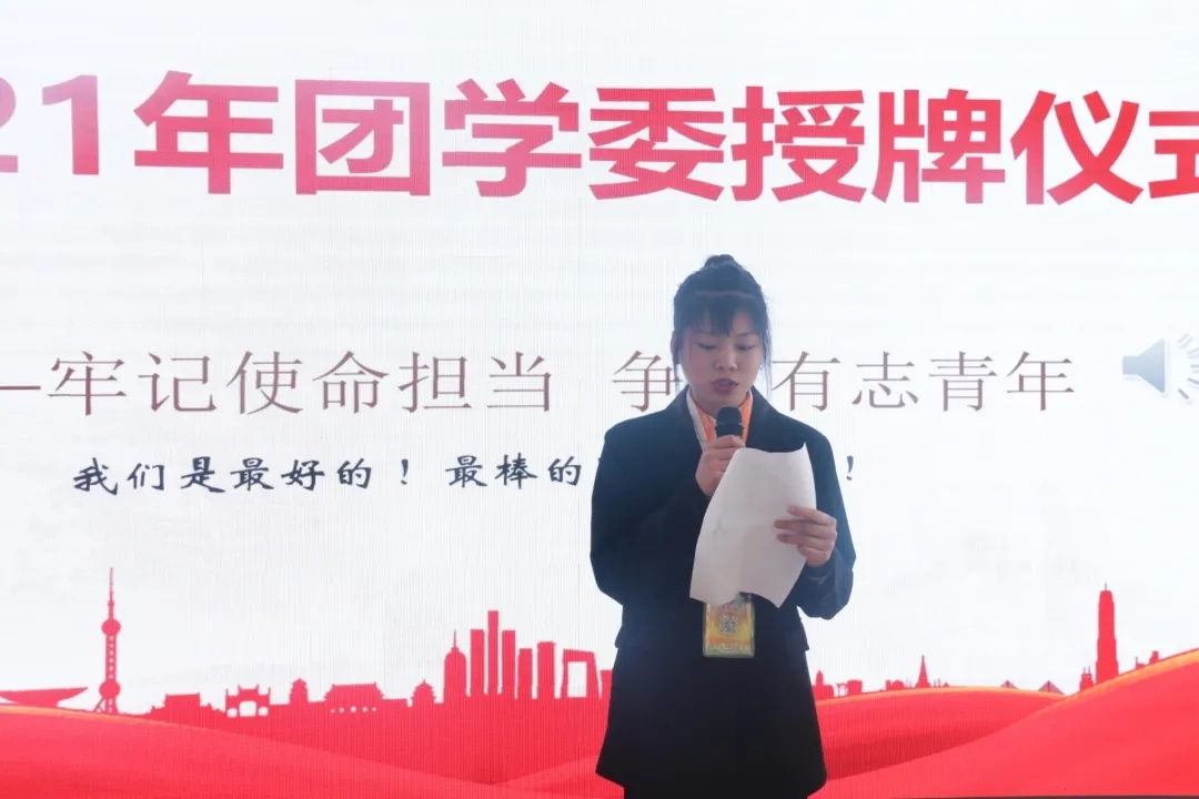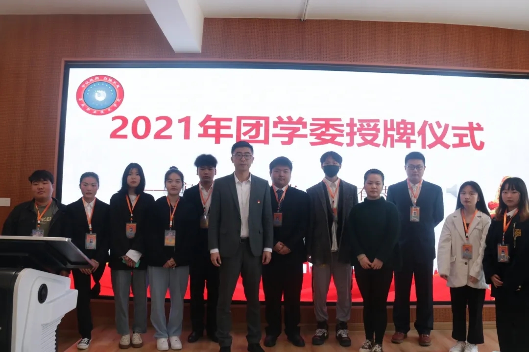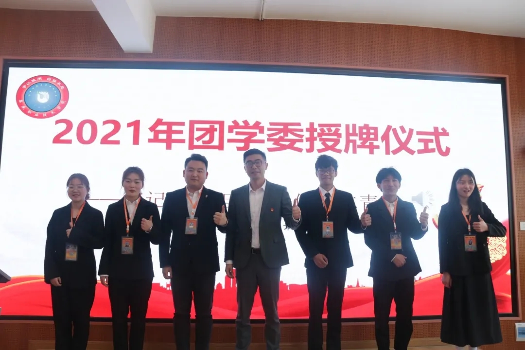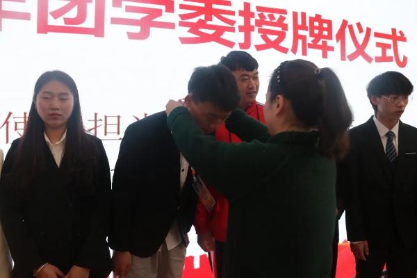 主持人宣读干部及各二级学院团总支副书记授牌名单并进行授牌仪式授牌仪,由团委书记石磊,团委副书记杨倩赟进行干部及各二级学院团总支副书记进行授牌,一张又一张青春洋溢的笑脸是对工作怀揣着无比的热情与信心