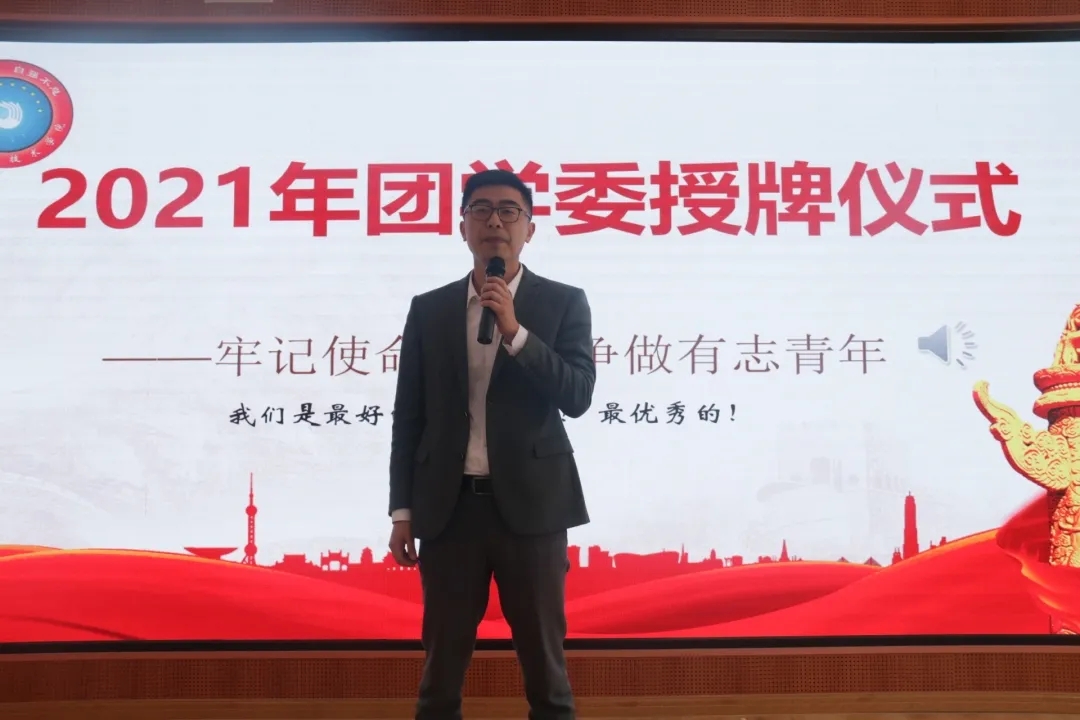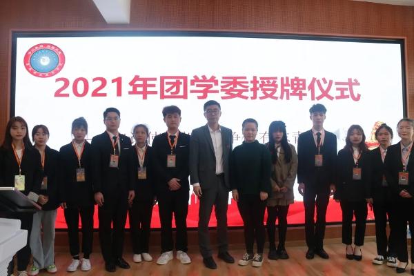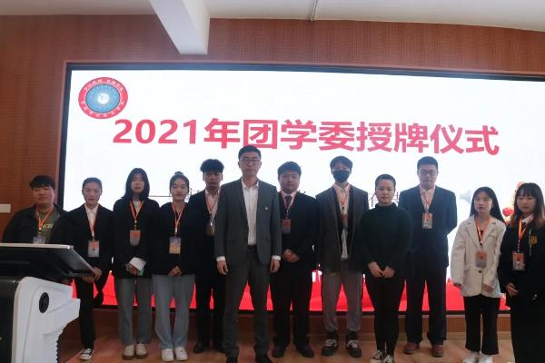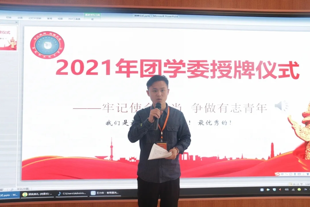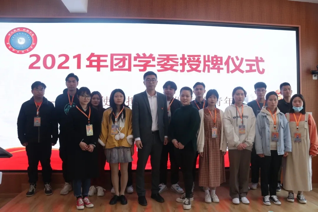 3月25日中午我校团学委授牌仪式在创客空间举行,莅临本次授牌仪式的各位领导老师有团委书记石磊书记、团委副书记杨倩赞副书记、校团委指导老师游俊老师、学社联指导老师李景亮老师,以及各二级学院的团副,19级团学委所有干部。本次会议由邹晶欣主持。