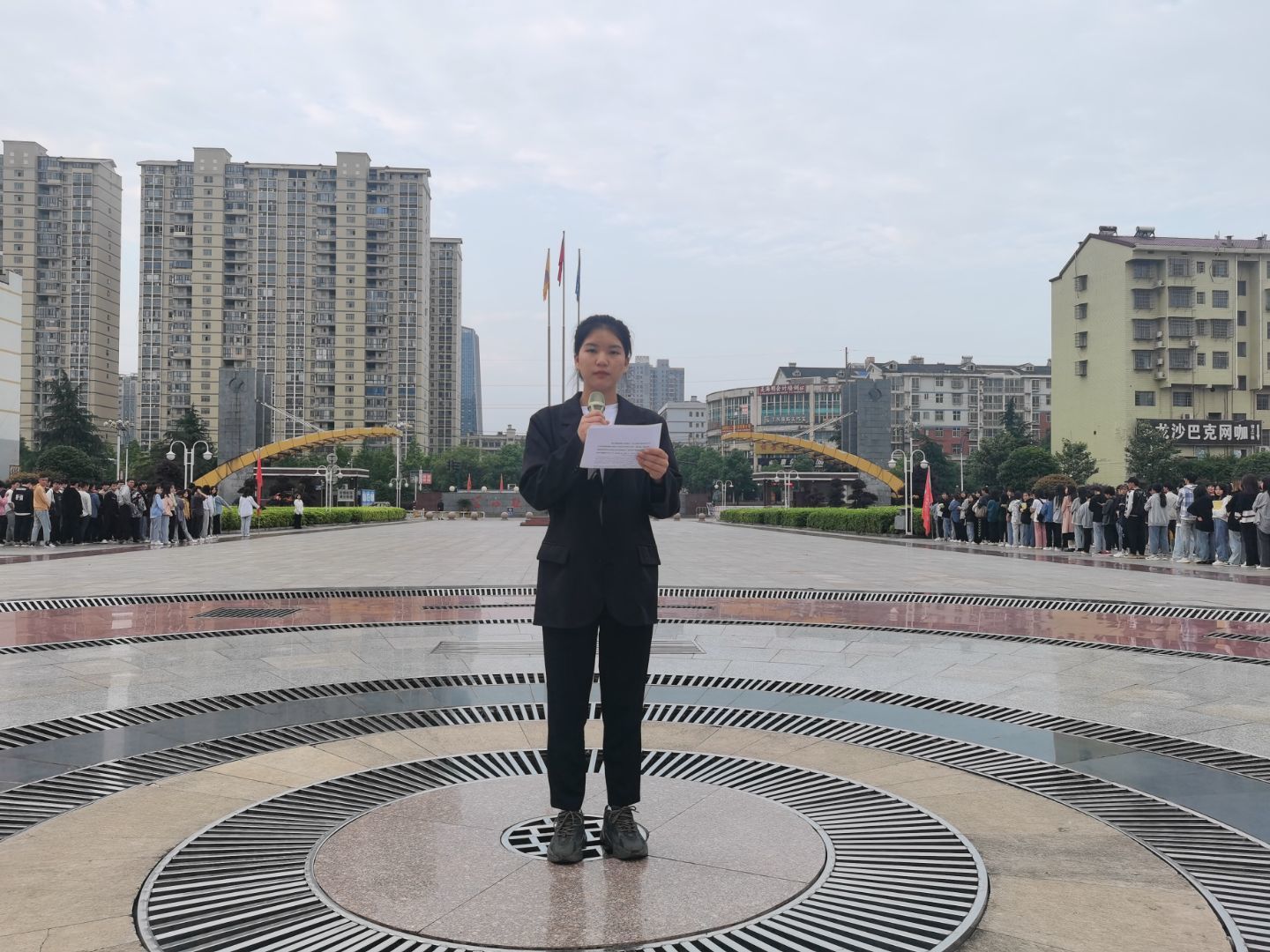 礼毕,来自商学院19电商三班张玉娇同学代表全体师生在国旗下发表以《禾下乘凉梦,不悔是初心》为主题的讲话,今天是袁隆平院士逝世的第三天,人民摘来青翠的禾苗,放在中南大学湘雅医院门前的空地上,寄托无尽的哀思。他是我国研究与发展杂交水稻的开创者,也是世界上第一个成功地利用水稻杂交优势的科学家,被誉为“杂交水稻之父”。袁爷爷作为杂交水稻第一人,仍在“禾下乘凉梦”和“杂交水稻覆盖全球梦”中不知疲倦的探索耕耘。他用他的一生鼓励新时代的中国青年在追求真理的道路上躬行实践、厚积薄发,并将不会辜负时代的担当。他的奋斗精神激励青年学子为了自己的梦想不断前行努力,在新征程上凝聚磅礴的力量。