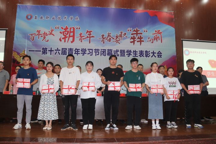 "百年党史潮青年,青春娄职犇向前” 6月16日19点30分,我校在新培楼102会议室举行第十六届青年学习节闭幕式暨学生表彰大会。党委委员、副校长欧芳,学工处处长李规,校团委书记石磊,各二级学院党总支书记、学工副院长、团总支书记,获奖同学和部分师生代表参加本次活动。仪式由校团委书记石磊主持。