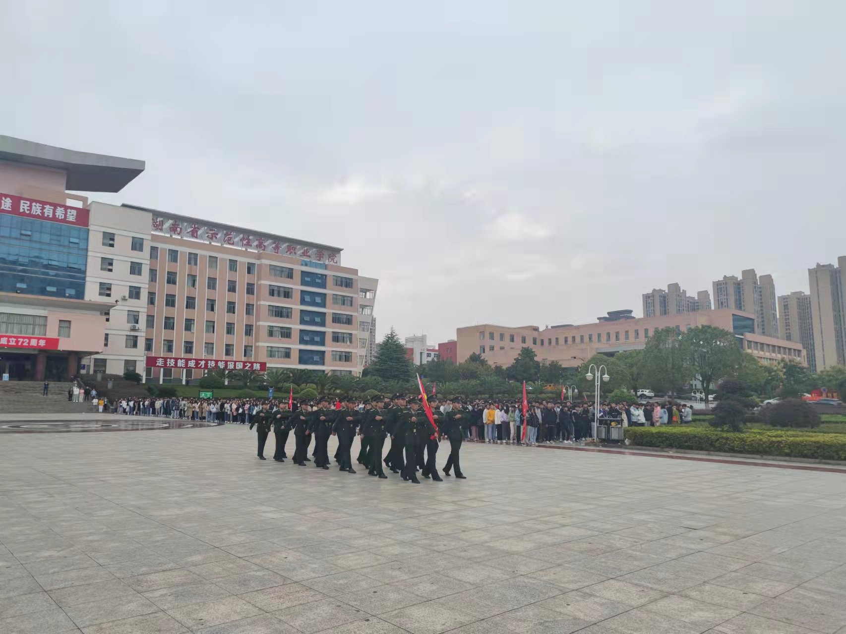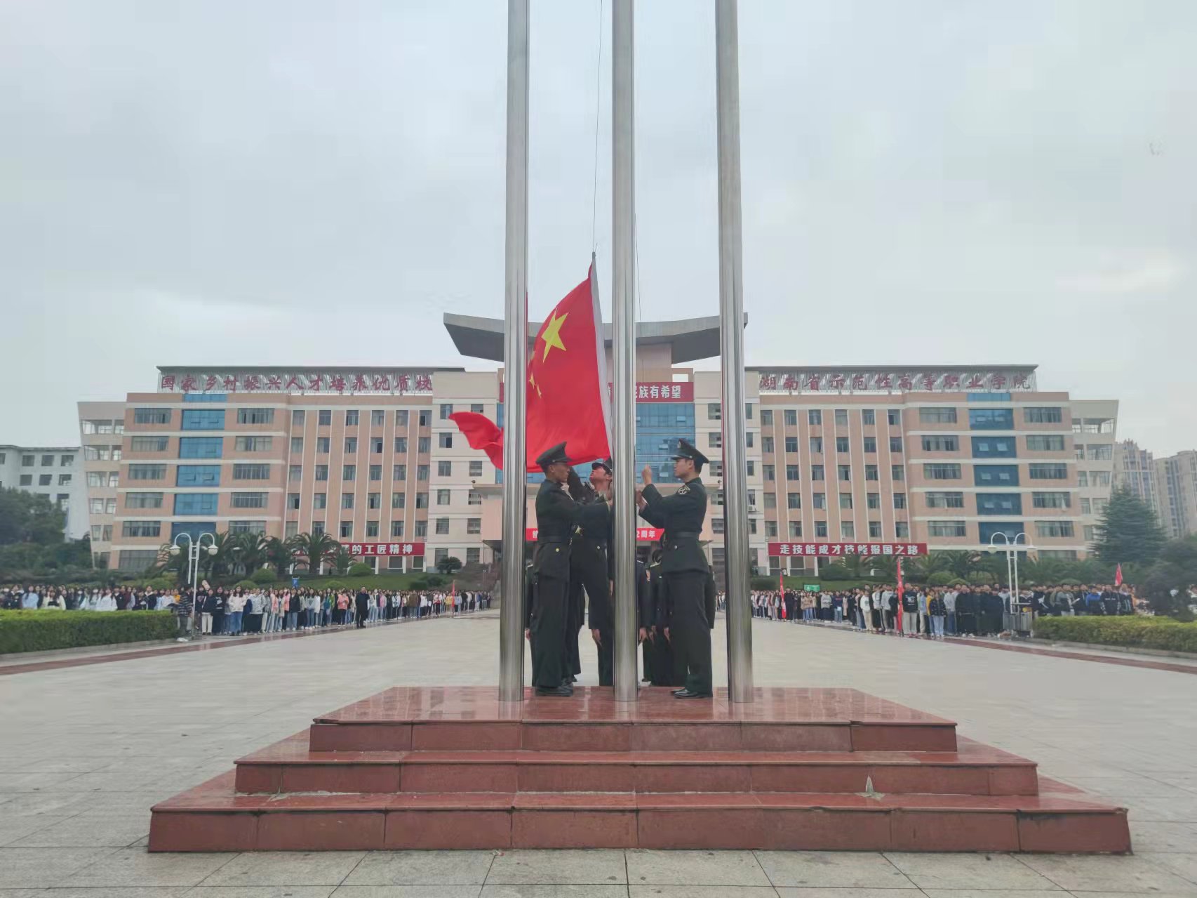 娄职20,21级在校生集合完毕,随着一声“正步走”的口令,国旗班以铿锵有力的正步步伐迈向国旗台“向国旗--敬礼!”伴随着响亮的口号,国旗班行礼,奏响《义勇军进行曲》,升旗手高高扬起红旗,英姿飒爽,鲜艳的国旗迎风招展,在全场庄严的国歌声中缓缓升起。