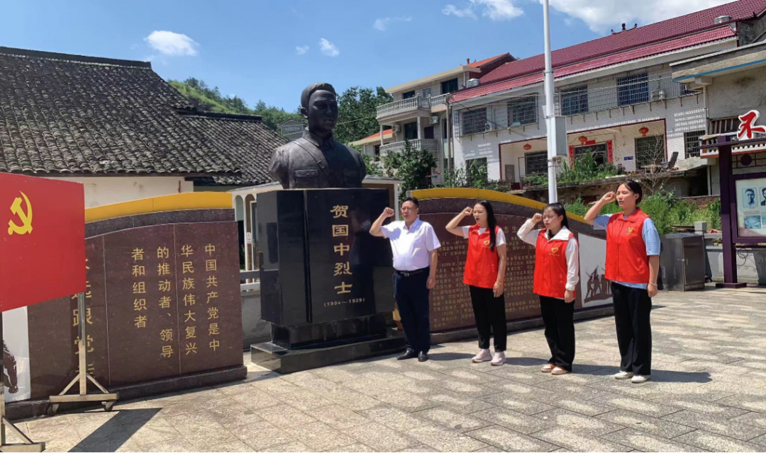 7月9日,实践团队去到了贺国中故居进行参观学习。在贺国中后人带领下,实践团队来到贺国中同志纪念馆内,实践团成员驻步凝思,回顾着贺国中同志短暂而又不平凡的一生。随后去到了贺国中故居广场,志愿者们进一步了解了贺国中烈士的英雄事迹。