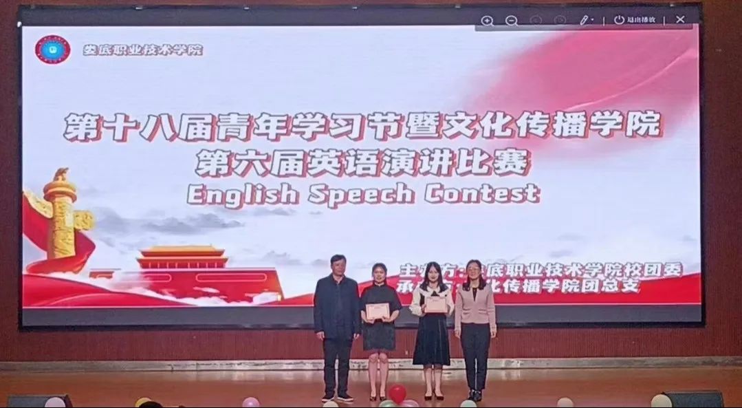 出席此次活动的有文化传播学院院长肖付良、党总支书记刘寿松、学工副院长谢花萍、商务英语专业教研室主任田玉、团总支书记李悦、公共英语教研室主任赵熹妮以及外教James。本次英语演讲比赛由阳苗、雷文卓、李熠珣、田梦琪主持。