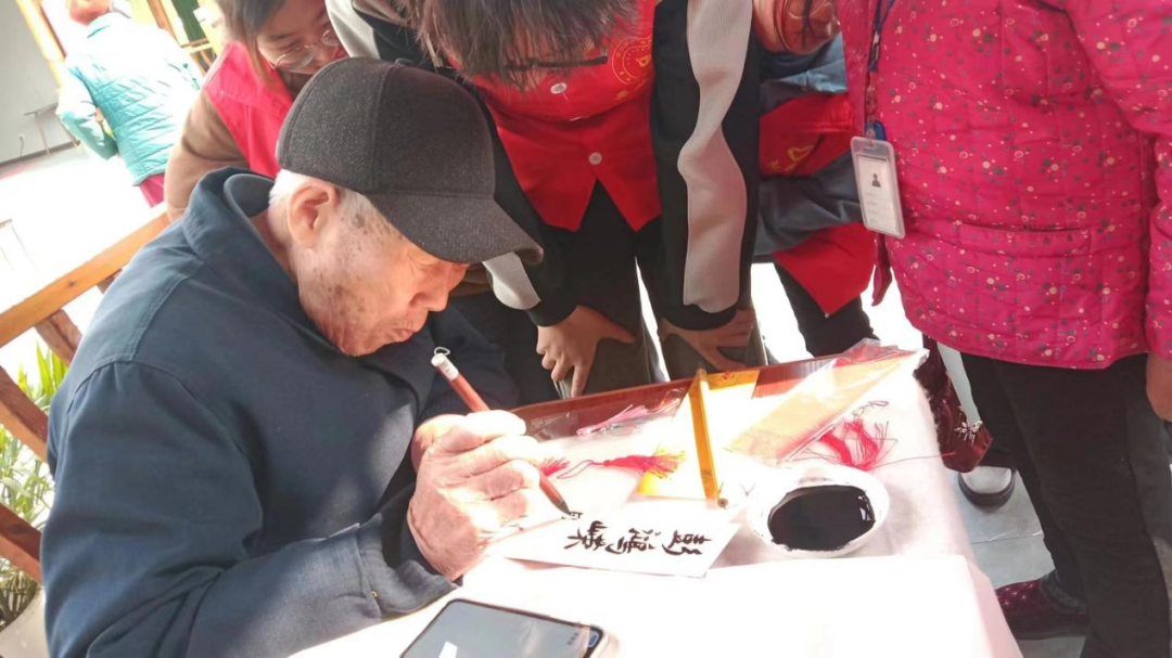 随后接着的是书法志愿者们在准备的书签上根据老人要求现场为老人写上祝福或姓名作为纪念。