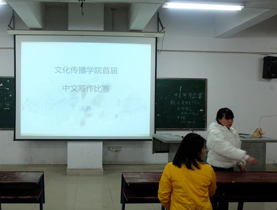 为了充实同学们的课余生活,丰富想象力和创造力,加深文学素养,发掘文艺人才,提高写作水平,以笔代口,表达自己的内心世界,提高我们大学生的整体素质修养。我院于11月23日下午4点在主教楼210举行了以《我的_____》为主题的中文写作比赛。文化传播学院学工处副院长贺建良,辅导员柯莎、刘露,主持人及80多位参赛者参加比赛。