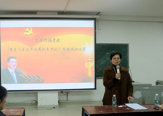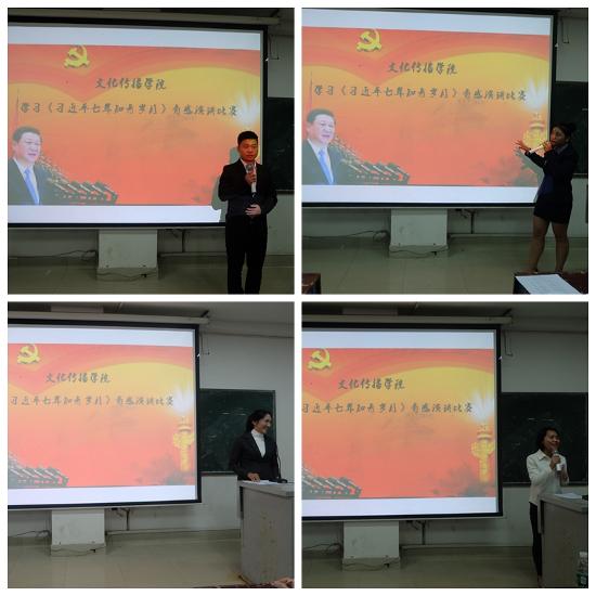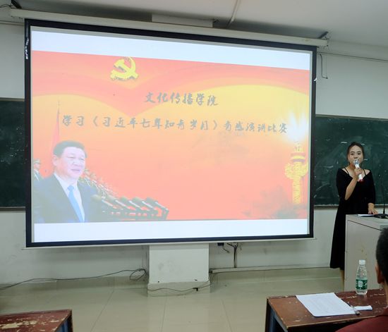 10月30日晚上7:00,文化传播学院在主教楼610举办学习“习近平七年知青岁月”有感演讲比赛,文化传播学院院长刘燕,学工副院长贺健良,辅导员刘容梅、刘露、柯莎、黄静,17级各班代表及12位参赛选手近200人参加,本次演讲比赛由吴玥琼同学主持。