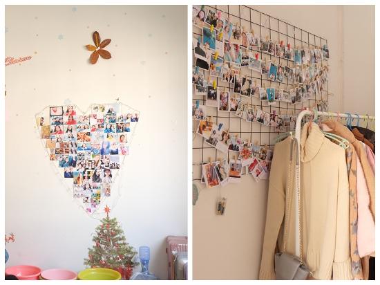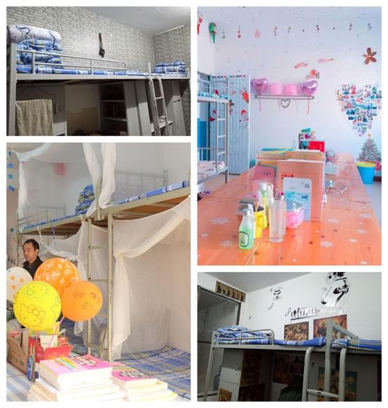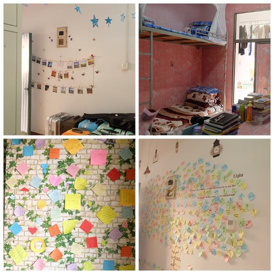 各个寝室风格不一:有在墙上设置许愿树、照片墙、有用自己折的星星、剪的花朵、捡的树叶做装饰的;有把寝室各成员的手掌印满整片墙壁的,还有为过元旦做准备的。更有趣的是每个寝室的名称如:小美好、总经理室、小仙女寝室等等。在她们的巧手下,单调的寝室变成了一个温馨漂亮的小家。