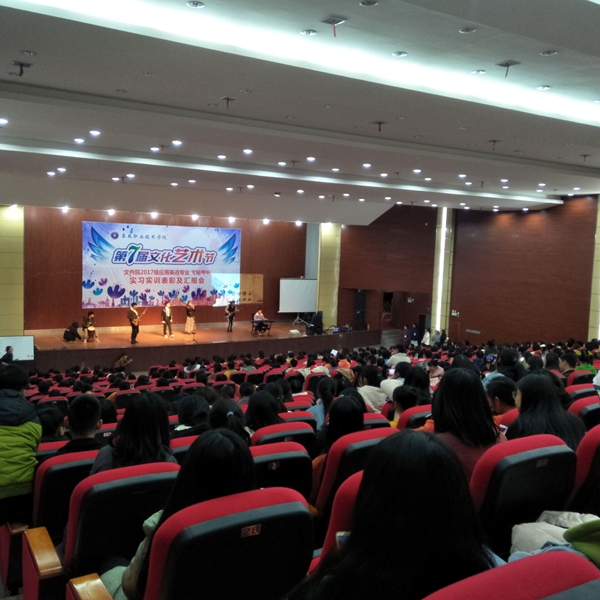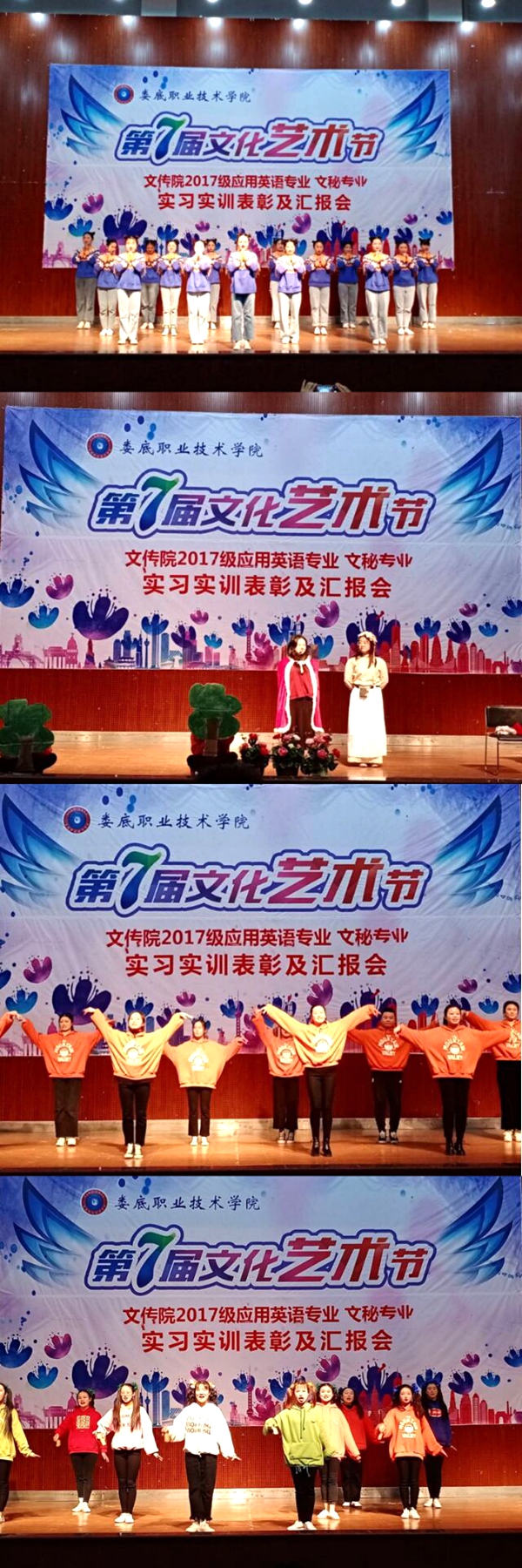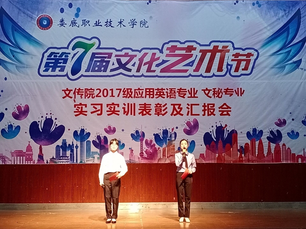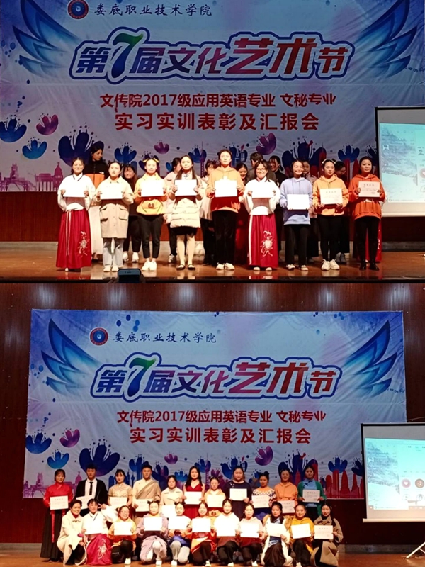 2019年12月4日晚19:00,文化传播学院在新培楼报告厅102举行17应用英语专业、文秘专业实习实训表彰大会暨汇报演出。出席本次活动的嘉宾有督导团团长吴莲贵,院长刘燕 ,副书记李飞轮, 学工副院长贺建良,教学副院长肖付良以及参与指导实习实训的张湘波、赵熹妮、邱秋芬、周志军、刘巧莉等15位老师。本次晚会由沈灿、甘慧芳主持。