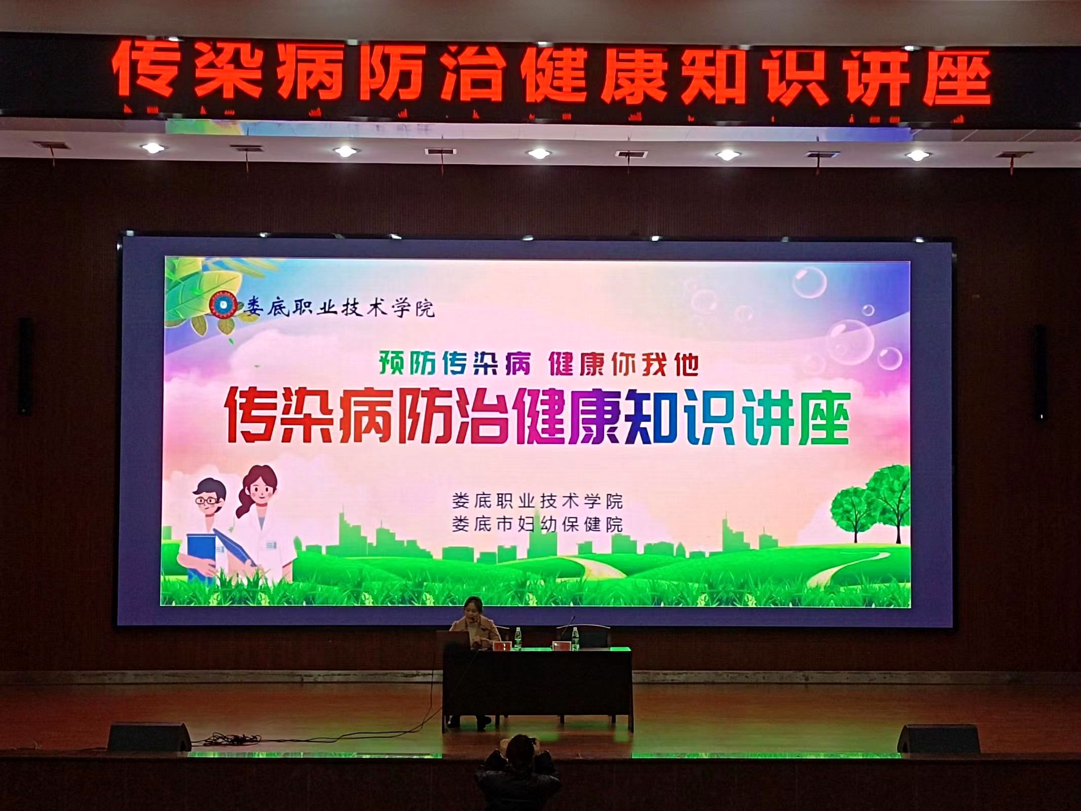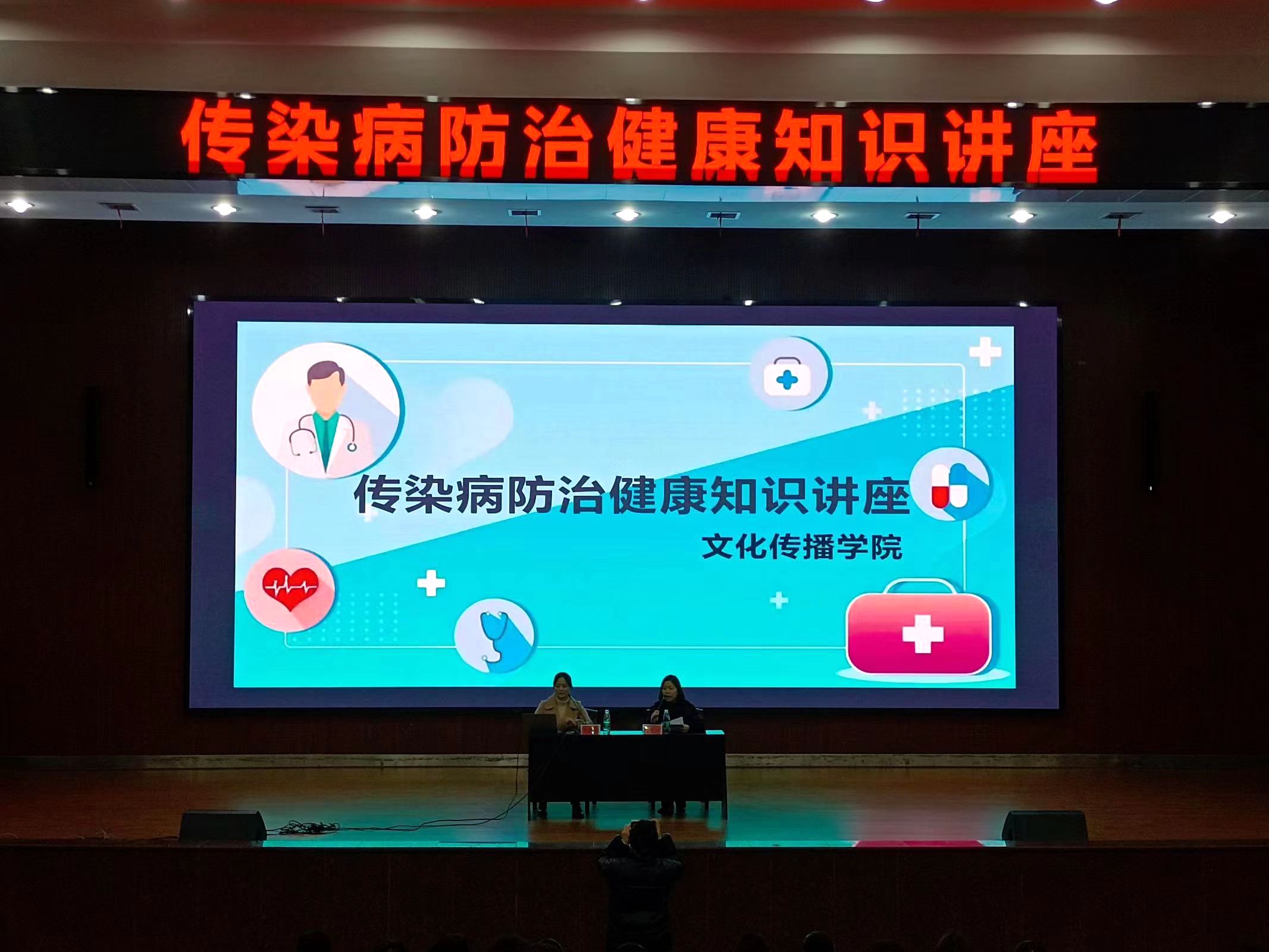 为增强同学们对春季传染病知识的了解与预防,文化传播学院于2023年3月22日晚上19:00在新培楼学术报告厅开展传染病防治健康知识讲座。出席本次讲座的有文化传播学院学工副院长谢花萍,学工干事李景亮、周科伶,辅导员刘巧莉、黄静、章威、邹敬伟等。以及娄底市妇幼保健院专家。