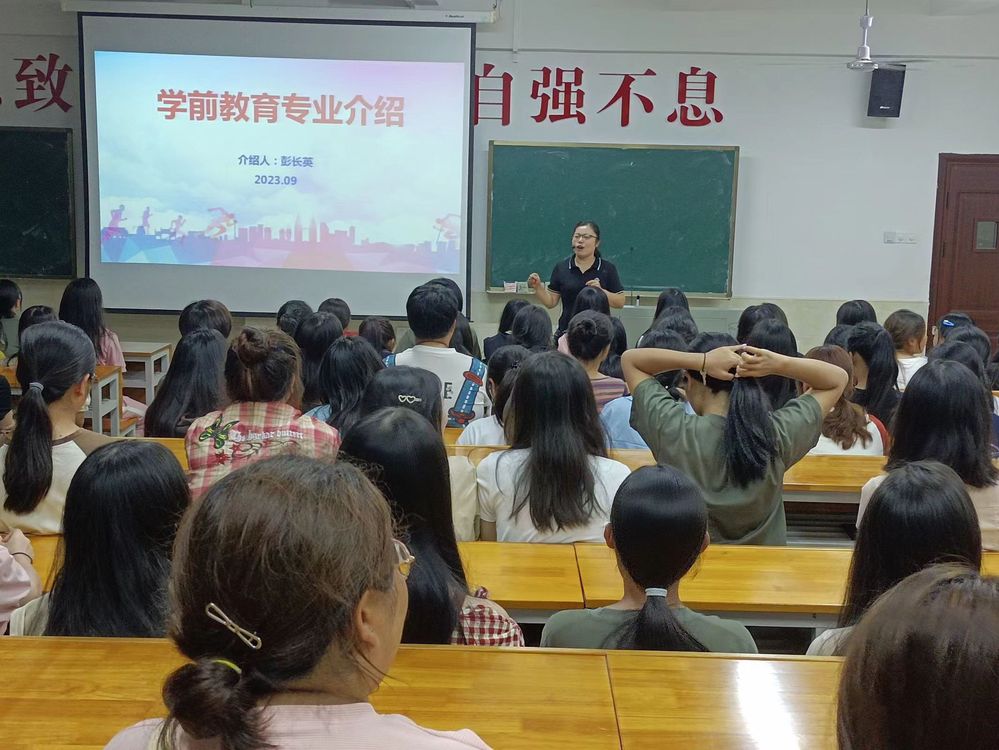 为帮助23级新生充分了解自己的专业,对接下来的学习生活有更加清晰的规划,文化传播学院于2023年9月13日晚7:30组织23级全体新生在主教楼5、6楼举行新生专业介绍讲座。院长肖付良、教学副院长谢丹、学工副院长谢花萍和23级新生班辅导员参加讲座。本次讲座由文化传播学院学前教育专业教研室主任彭长英、婴幼儿托育服务与管理专业教研室主任肖艳、应用英语专业(国际商贸方向)教研室主任田玉、应用英语专业(小学幼儿英语教育方向)教研室主任张湘波主讲。