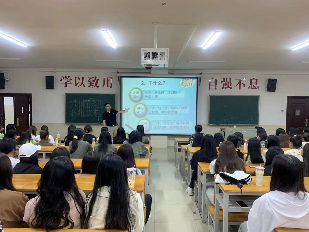 张湘波老师对应用英语专业(小学幼儿英语教育方向)进行了详细讲解,从为什么、学什么、怎么学、以及之后的目标岗位展开分享。他介绍了应用英语专业的市场需求、就业方向、开设的主要课程及在大学期间要考的职业资格证书等。他鼓励同学们在校期间加强英语听说读写训练,学好专业知识,做到践行师德、学会教学、学会育人、学会发展。