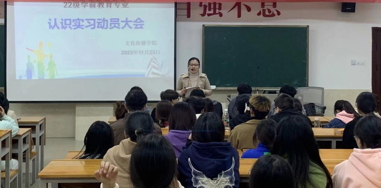 为扎实做好2022级学前教育专业学生认识实习工作,引导学生明确实习目的、端正实习态度,做好实习前的准备,文化传播学院于2023年11月23日下午17:30在主教楼510组织2022级学前1、2、3、4班学生召开实习动员大会。参加此次会议的有文化传播学院学前教育专业教研室主任彭长英,辅导员刘巧莉、指导老师吴琴、彭维以及22级学前教育专业全体学生。大会由彭长英老师主持召开。