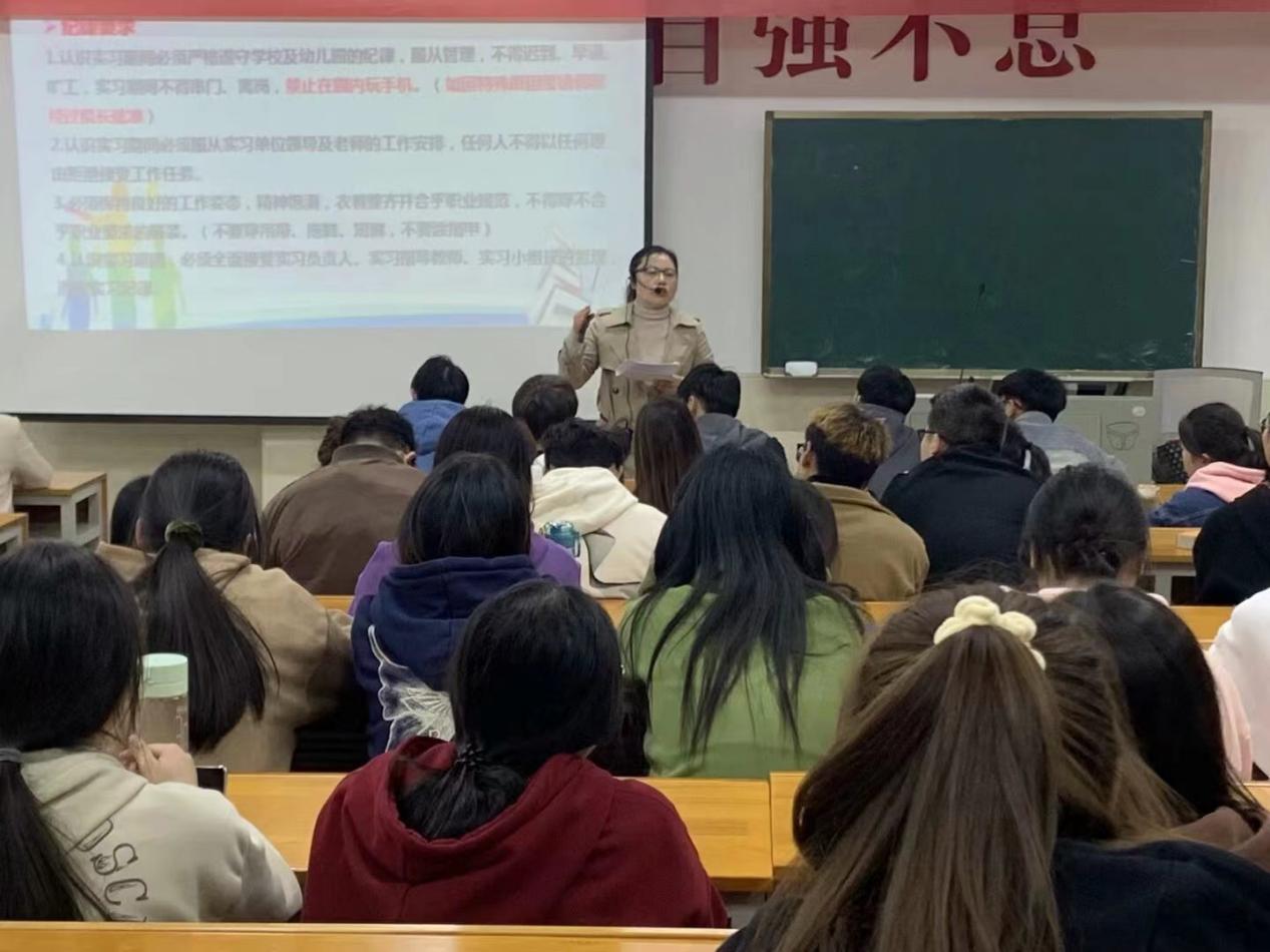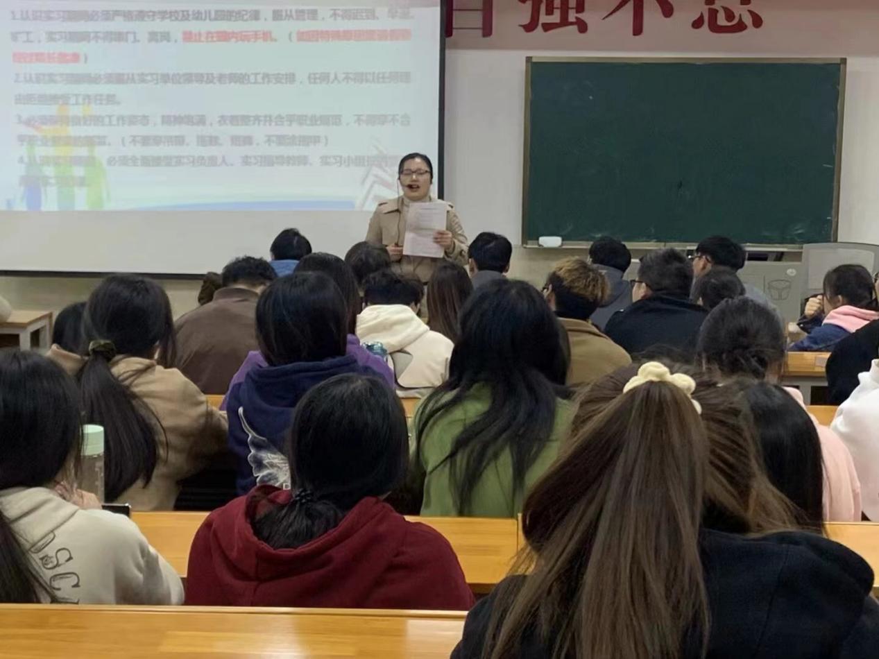 接着,她要求实习学生严格遵守学校及各实习园所的各项规章制度,做到不迟到、不早退、禁止在园内玩手机等,在幼儿园内应做到多观摩、多询问、多记录、多请教,树立良好的实习生形象,为实习园所服务,为文化传播学院争光。