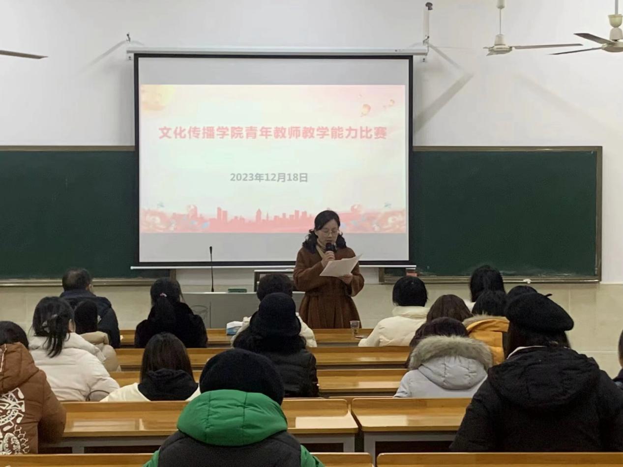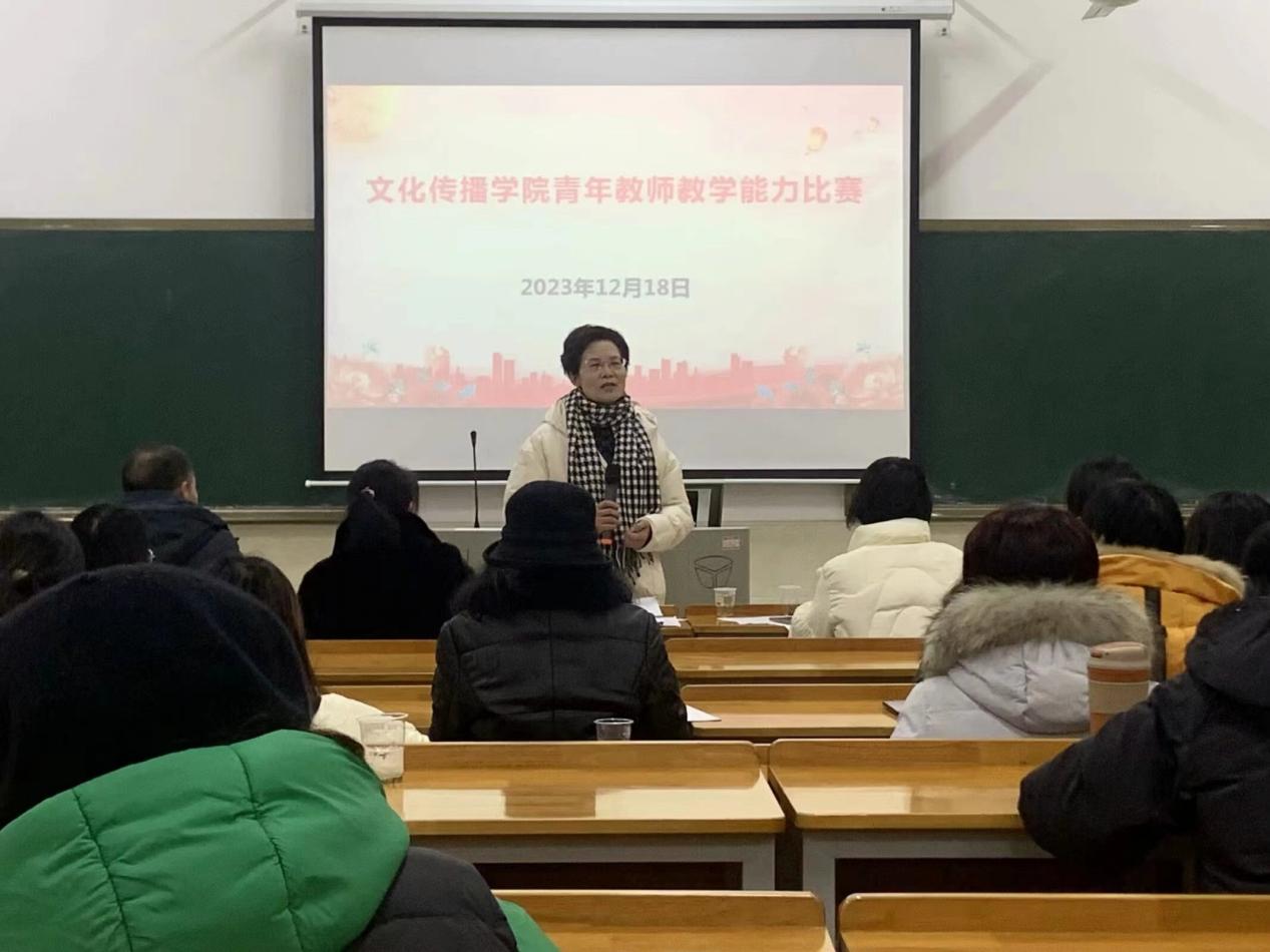 为持续深化教师、教材、教法“三教”改革,增强青年教师工作的责任感和使命感,营造一个“比、学、赶、帮、超”的浓厚教学氛围,帮助青年教师提高课程实施水平、提高教学质量、促进专业发展,文化传播学院于2023年12月18日下午14:00在主教楼118教室开展了主题为“赛课磨砺促提升,青年教师展风采”的青年教师教学能力比赛,共有19名青年教师参赛。本次比赛由校督导团刘燕团长、方忠南副教授、贺建良副教授、罗平良副教授、钟卫红副教授5位专家担任评委,我院领导班子带领全体教师参加了比赛活动。