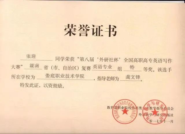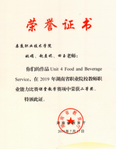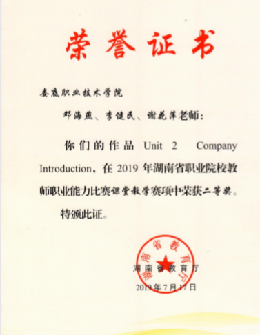 谢杰、龚文锋指导学生写作大赛湖南赛区均特等奖,姚娟微课大赛湖南赛区一等奖与外语教学大赛一等奖,张杨团队、姚娟与邓海燕团队、谢花萍团队与赵熹妮团队分获教师职业能力大赛省赛一等奖、二等奖、三等奖,邓海燕英语教学设计大赛一等奖,谢丹信息化教学大赛二等奖,谢杰英语教学设计大赛二等奖,李健民团队教师思政教育教学能力省赛三等奖。