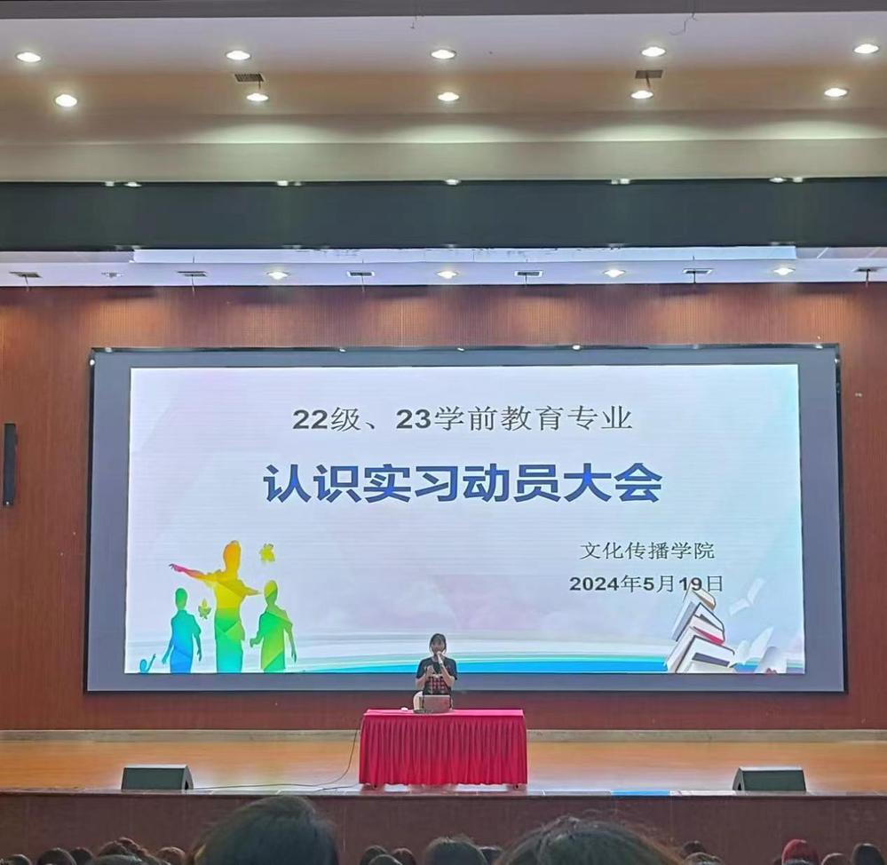为更好地推进学前教育专业认识实习工作,引导学生做好实习前的准备,文化传播学院于2024年5月19日下午18:50在新培楼学术报告厅组织22、23级学前教育专业全体学生召开实习动员大会。参加此次会议的有22、23级学前教育专业实习指导老师以及辅导员,此次会议由吴琴主持。