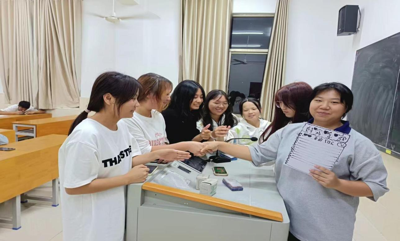 活动中,一系列有趣的宿舍团辅游戏成为亮点。其中,“优点轰炸”让大家互相发掘并赞美对方的优点,笑声和赞美声此起彼伏,空气中弥漫着满满的正能量! 而“微笑接龙”游戏更是将欢乐的氛围推向高潮,每个人都露出了最灿烂的笑容,游戏氛围愉快轻松,欢声笑语。
