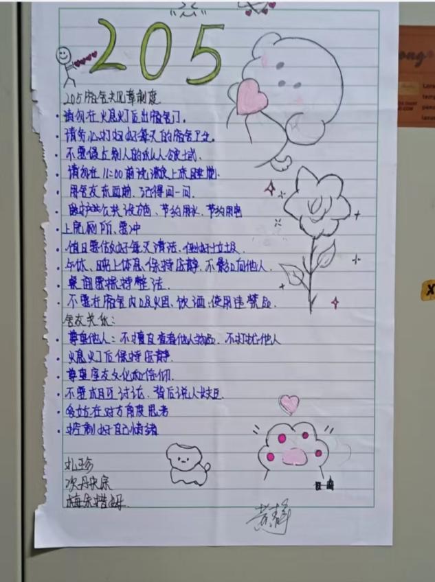 为了将这份和谐与幸福延续下去,同学们还共同制定了寝室生活契约书。契约书中涵盖了寝室成员的共同约定和奋斗目标,经过大家的一致认可和辅导员的签字后,它将成为寝室的“小宪法”,时刻提醒着每一个人珍惜彼此,共同维护这个温馨的小家。
