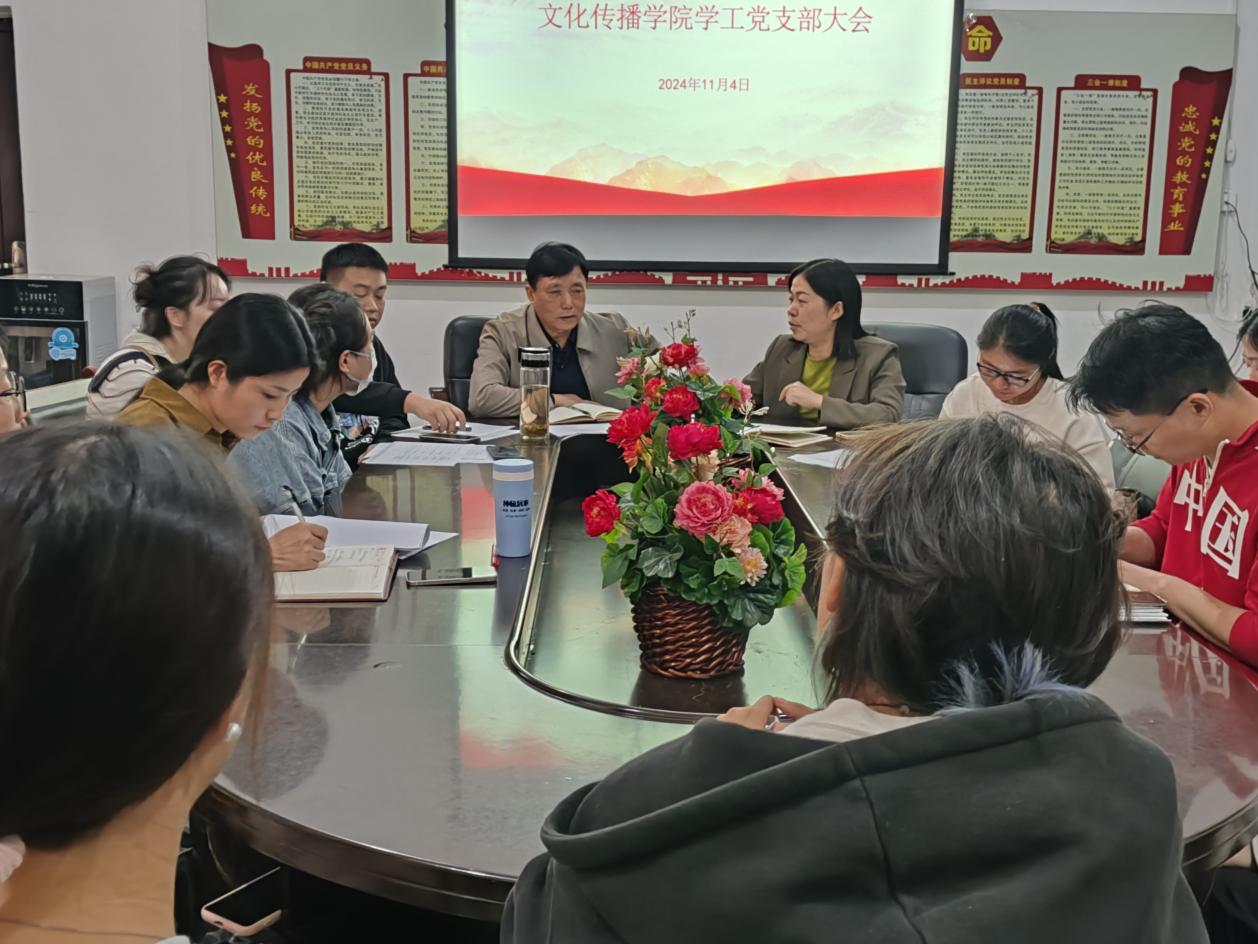 2024年11月4日下午16:30,文化传播学院在北科楼209召开文化传播学院党支部大会。出席此次会议的有文化传播学院党总支书记刘寿松、学工副院长谢花萍、学工支部的7名党员代表以及教师周科伶、资丽榕等5名入党积极分子。本次会议由学工副院长谢花萍主持召开。