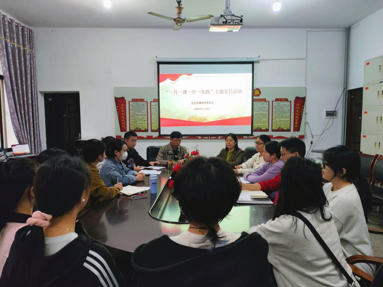 为深入学习党的历史,增强党员干部的理想信念和使命担当,文化传播学院于2024年11月4日下午17:00在北科楼209开展“一月一课一片一实践”主题党日学习。参与此次学习活动的有文化传播学院党总支书记刘寿松、学工副院长谢花萍、学工干事李景亮、6名教师党员代表以及资丽榕、邹海燕等7名入党积极分子。