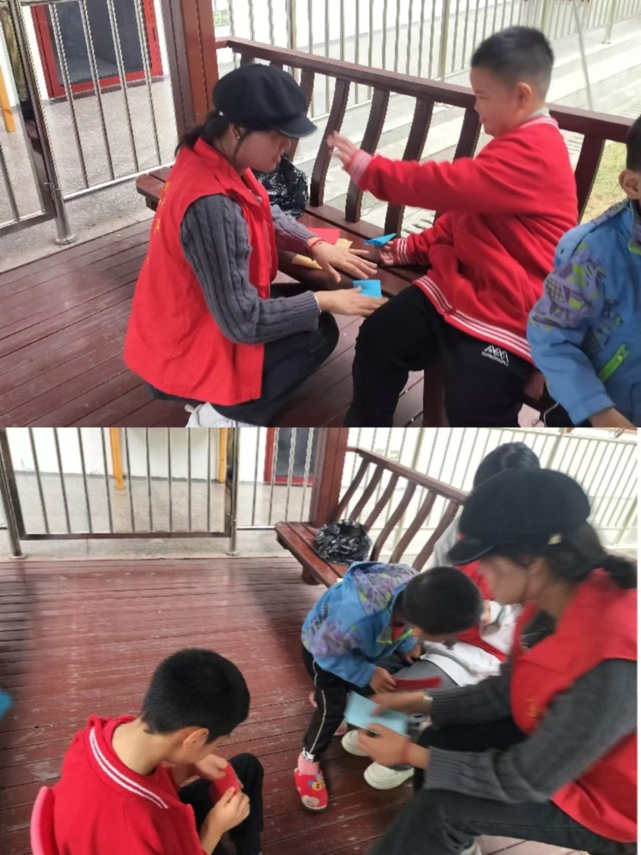 随后,志愿者们教小朋友们做手工,耐心的教他们如何折纸飞机;小朋友们表现出了浓厚的兴趣,有想学折小青蛙的,小狐狸的,志愿者们也是乐在其中,热情的教小朋友折纸步骤。他们的认真与投入让整个过程充满了童趣与欢乐。每一个孩子的笑脸都深深地牵动着志愿者的心。