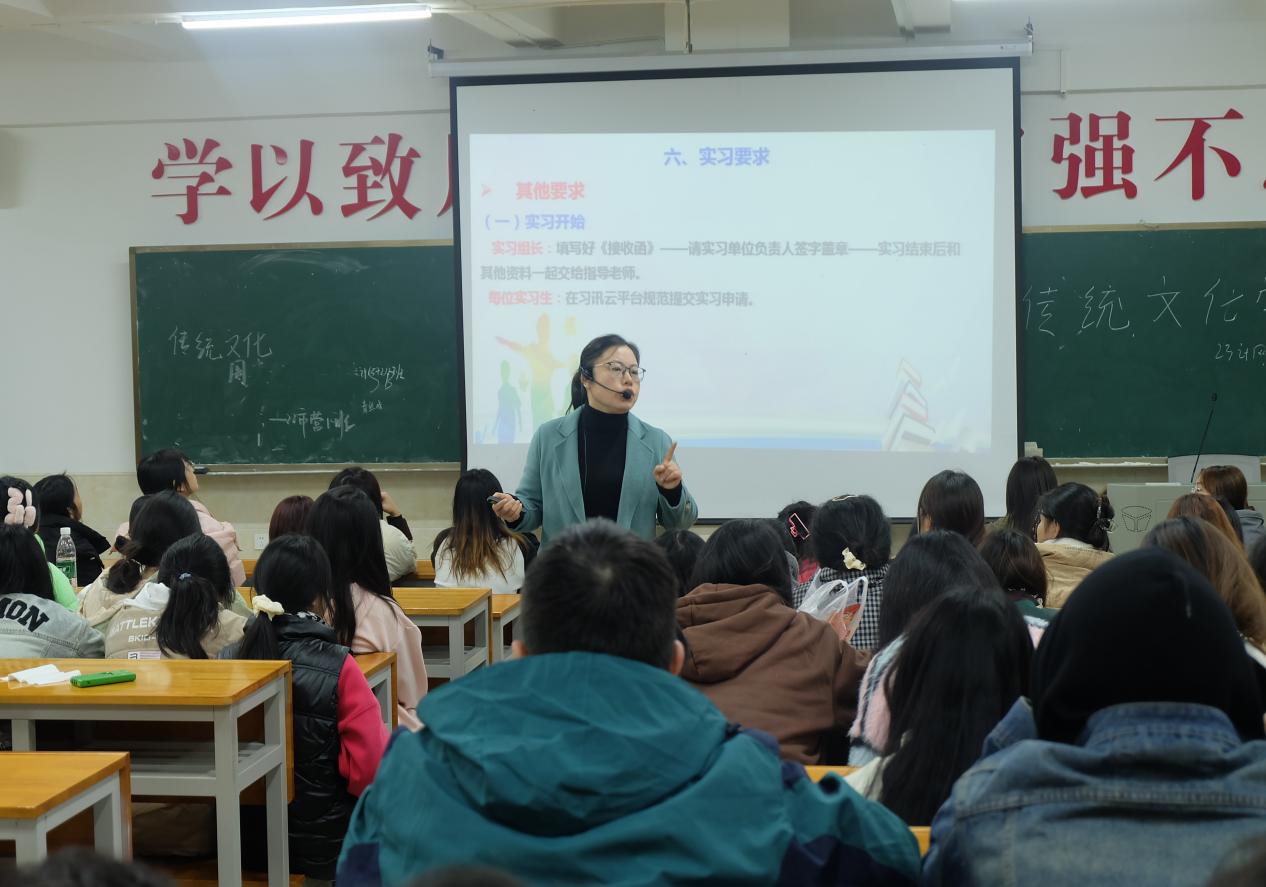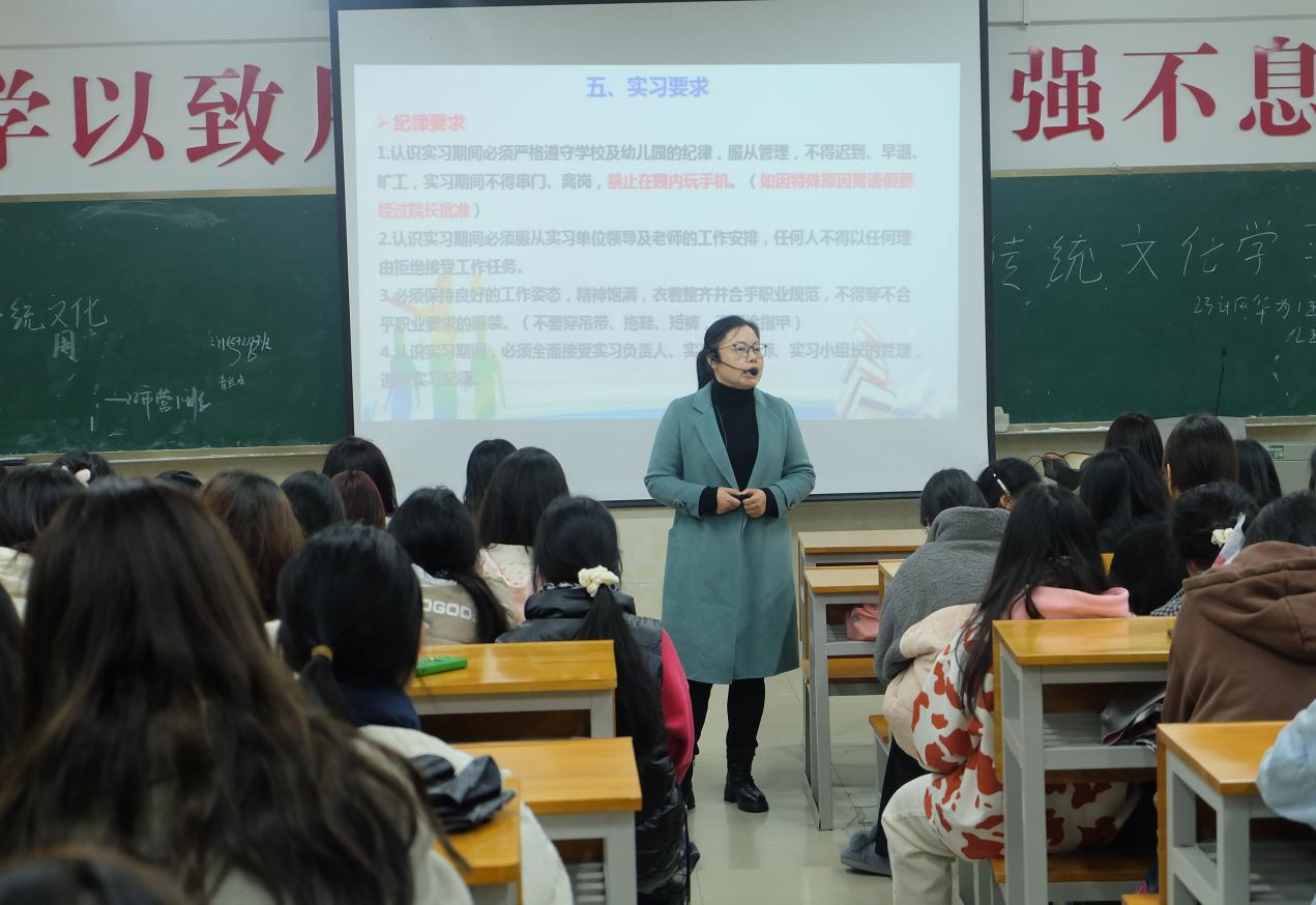 大会开始,彭长英老师介绍了本次实习的时间、地点,实习内容和实习要求,其中对实习要求重点讲解。彭长英老师讲到,在实习期间,实习生必须严格遵守学校以及幼儿园的纪律,服从管理,不迟到、早退、旷工,实习期间不得串门、离岗,特别强调禁止在园内玩手机。彭长英老师还对实习期间的纪律要求、考核标准以及安全注意事项等进行了着重说明,要求同学们尊重园方领导与教师,爱护幼儿,以积极主动的态度和高度的责任感完成实习任务。同时,鼓励同学们在实习过程中多思考、多提问、多交流,善于总结经验,不断提升自己的专业水平。