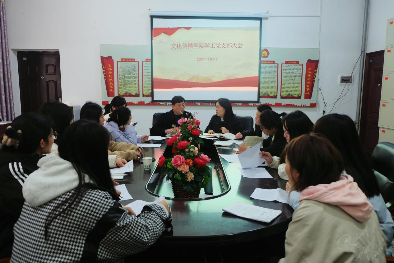 为进一步加强基层党组织建设,落实党支部发展党员工作,文化传播学院学工党支部于2024年12月5日上午11:00在北科楼209召开关于“将发展党员吸收为预备党员”的专题会议。出席此次会议的有文化传播学院党总支书记刘寿松、学工副院长谢花萍、学工党支部所有党员以及资丽榕、邹海燕等7位党员发展对象。此次会议由学工副院长谢花萍主持召开。