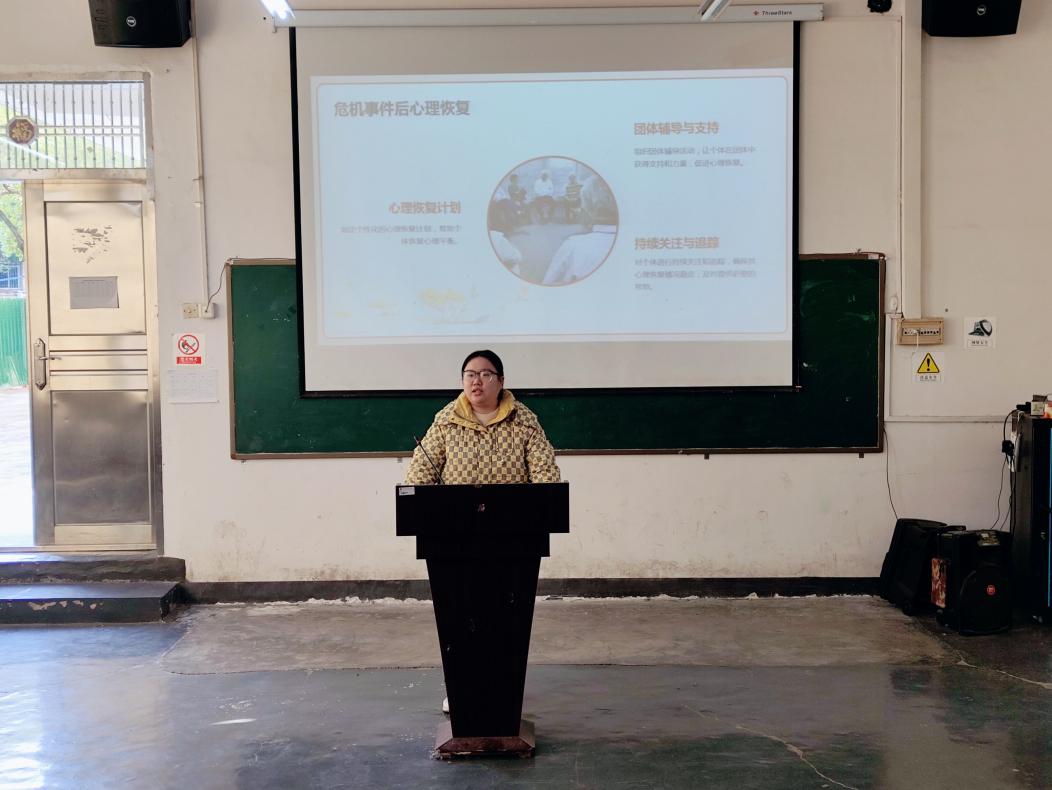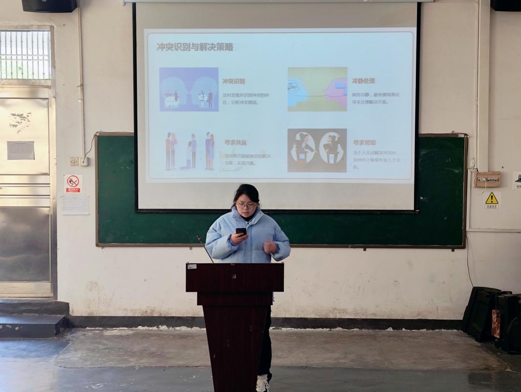 随后,心教部干事黄悦借助内容详实的 PPT 进行深入讲解。 先清晰阐述心理委员职责范围,包括同学心理状况的日常观察、心理问题的初步评估与及时反馈等核心要点,让大家明确自身肩负的重任。接着在沟通技巧的分享中,通过列举案例,讲解了如何运用同理心倾听、积极反馈等技巧与同学进行有效心理沟通;在情绪识别与应对方法讲解时,详细解析各类情绪表现特征,并分享情绪安抚与疏导的实用策略;针对常见心理问题处理,分析了如焦虑、抑郁等问题的早期迹象与应对举措。