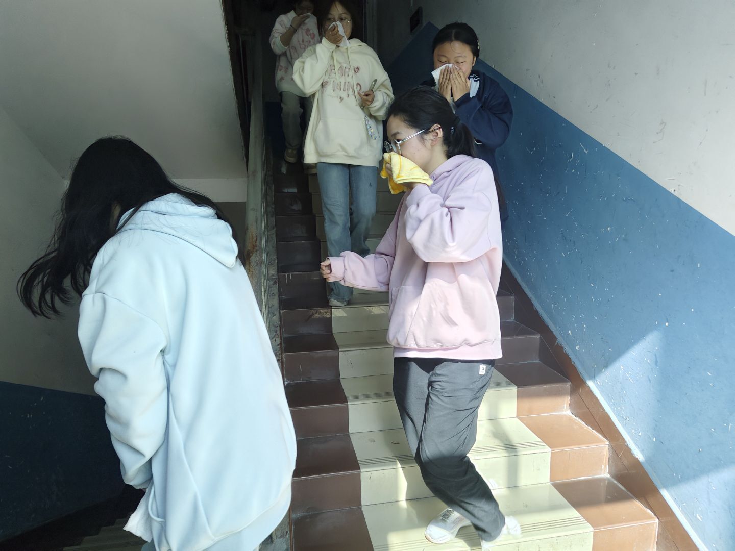 急促的应急哨声准时响起,演练正式启动。听到信号后,宿舍内学生迅速反应,立刻放下手中事务,用湿毛巾或衣物紧紧捂住口鼻,弯腰低姿,按照预先划定的疏散路线,快速向楼道出口移动。过程中,大家保持前后间距,不慌不乱、不推不挤,展现出良好的秩序感。各楼层疏导员坚守岗位,一边指引方向,一边提醒学生 "注意脚下"" 快速通过 ""不要停留",及时疏导人流,确保疏散通道畅通无阻。部分学生主动帮扶行动较慢的同学,彰显了互助友爱的良好风尚。最终,全体参与人员仅用时数分钟便安全、有序集结至励志广场指定区域。现场工作人员迅速清点人数,逐一核对名单,确认无人员遗漏、无安全事故。