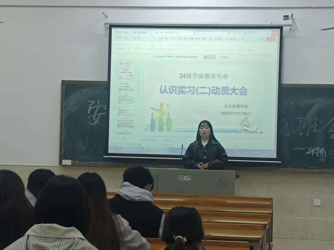 为进一步明确实习任务与要求,系统部署实习相关工作,文化传播学院于2025年11月16日在主教楼302组织召开2024级学前教育专业认识实习动员大会。会议由章威、黄静两位老师主讲,2024级学前教育专业全体学生参加。