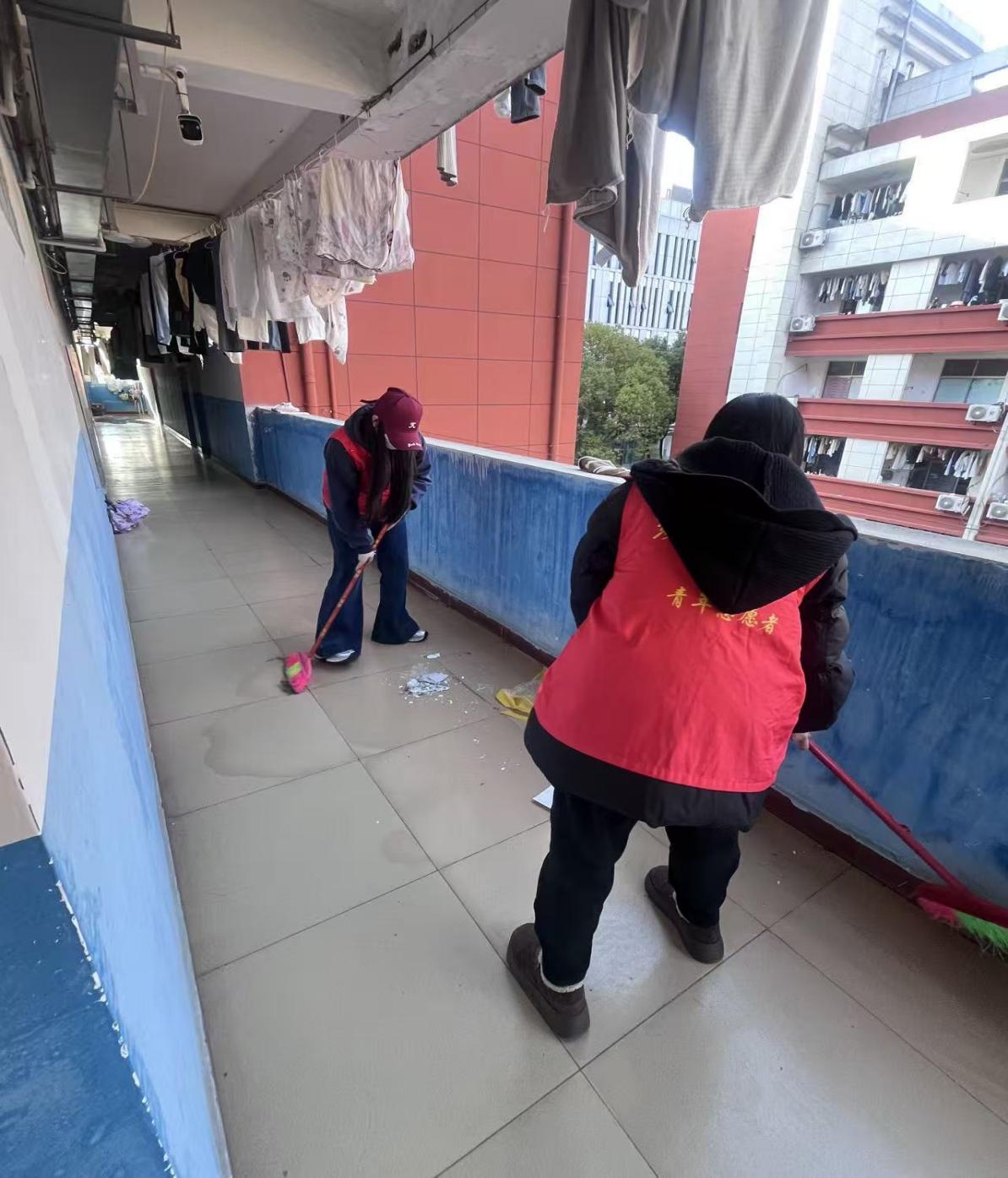 活动期间大家分工明确、协作有序,重点对楼道、走廊、楼梯间等公共区域进行清理。针对天花板蜘蛛网、墙面牛皮癣小广告、楼梯扶手栏杆等易忽视点位,同学们耐心细致、逐一攻坚:或踮脚清理高处积尘,或蹲身铲除顽固污渍,或反复擦拭栏杆直至光洁如新。劳动现场氛围热烈,大家不怕脏、不怕累,以实际行动践行奉献、友爱、互助、进步的志愿精神,充分展现学生骨干的先锋模范作用。