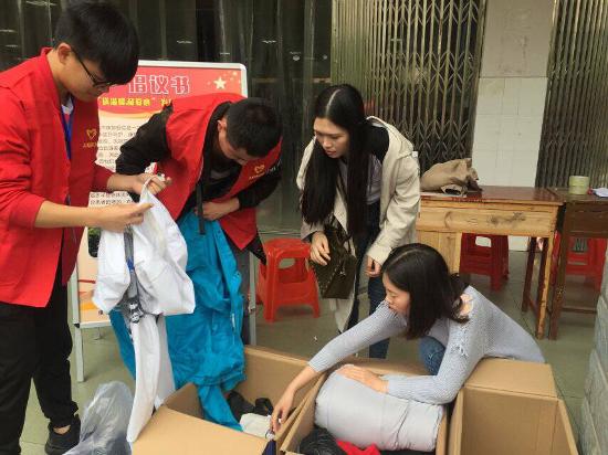 活动当天,许多同学、老师提着大小包的衣服前往募捐现场,捐赠的衣服主要包括毛衣、大衣、棉服、羽绒服等御寒的衣物,校团委青工部的工作人员登记了每个前来赠衣的老师、同学的信息。
