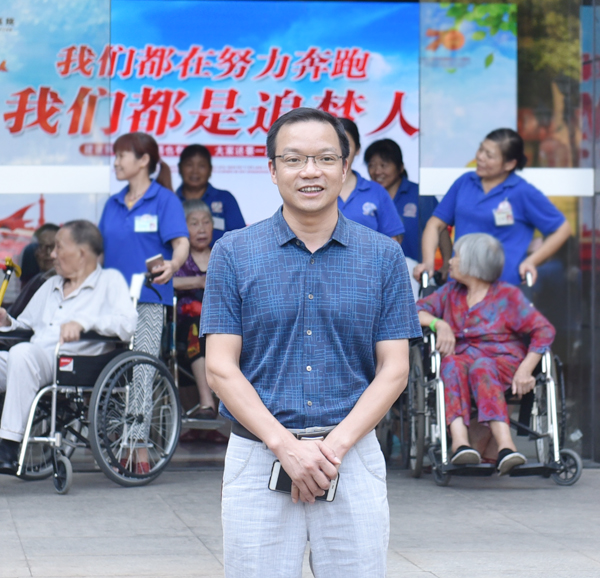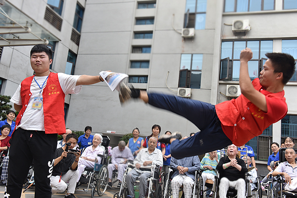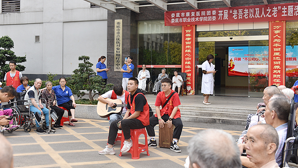 在康复医院颐康楼前,青年志愿者们带来了乐器弹唱、武术、现代舞等表演,赢得了老人们阵阵热烈的掌声。