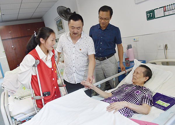 在康复医院,游骏率领青年志愿者们慰问了罗盛教烈士的妹妹罗亮香老人。康复医院老年医疗呵护中心大科主任兼A区主任廖秋莲介绍说,罗亮香老人2017年入院,下肢瘫痪但头脑清醒,是医院的一级护理老人。罗亮香老人拉着志愿者、一只腿高位截肢的2019级电子商务班同学韩力的手,给大家讲起了自己家的故事。