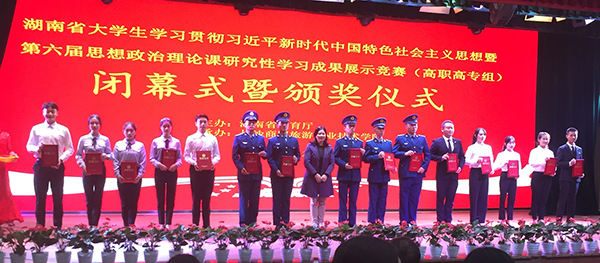 9月27日,湖南省大学生学习贯彻习近平新时代中国特色社会主义思想暨第六届思想政治理论课研究性学习成果展示竞赛决赛圆满落幕。本次竞赛由省教育厅主办,湘潭大学和长沙商贸旅游职业技术学院承办。全省共有11所本科高校和20所高职高专院校进入决赛,在决赛中各研究性学习小组充分展示学习成果,反思研究中存在的问题,交流各自的收获和体会。在辜桃、谢明老师指导下,经过紧张激烈的角逐,我校学生刘凯豪、曾威淳、周璟、沈灿、王宇参赛队成果荣获高职高专组一等奖。