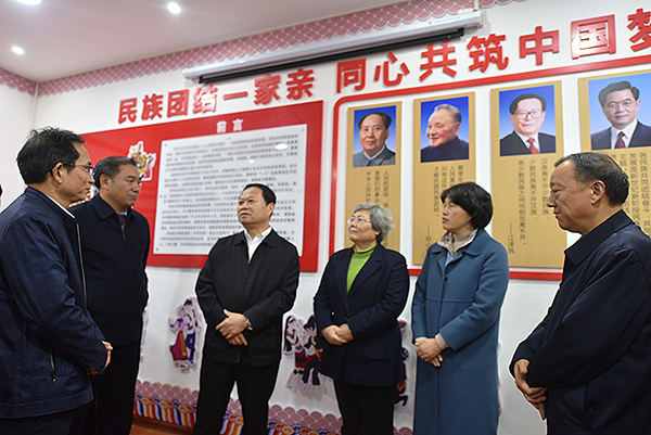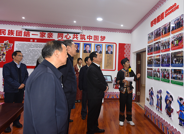 在学校民族团结进步教育展览室,调研组在少数民族学生讲解员引导下进行参观,并饶有兴致地观看了我校民族团结进步教育宣传片。