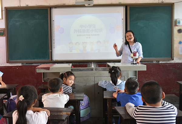 农林学院党总支书记王冬青在“应急处理方法培训乡村中小学行”活动启动仪式上致辞。她介绍了基地的有关情况,希望同学们树立科学的理念,努力学习,学有所成后为国家贡献自己的力量。
