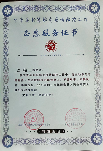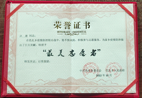 因为志愿行动表现优秀,当地政府给江措颁发了荣誉证书。