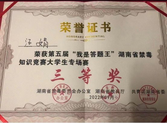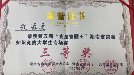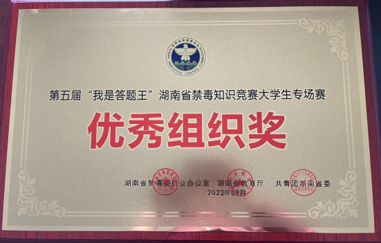 4月9日至10日,由湖南省禁毒委员会办公室、湖南省教育厅、共青团湖南省委、湖南省禁毒协会、湖南省学生联合会等单位主办的第五届“我是答题王”湖南省禁毒知识竞赛大学生专场赛在湖南警察学院举行。我校参与率排名全省前六,荣获“优秀组织奖”,我校老师杨倩赟、李悦获得优秀指导老师荣誉称号,我校学生张海英、汪娟、陈任一团队获得团体三等奖。