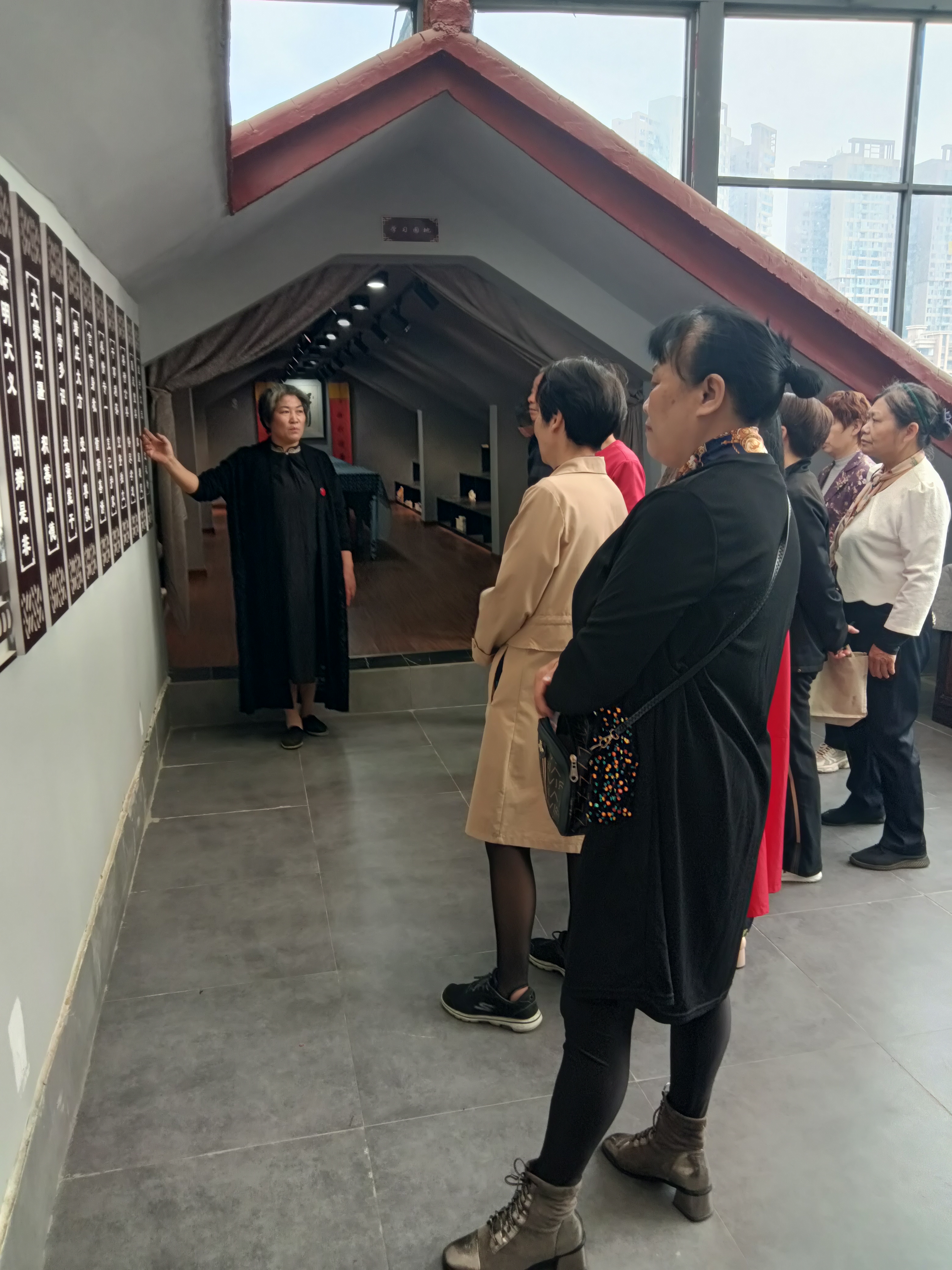 贤母文化研究会会长刘莉华首先带领全体社员参观贤母文化长廊,再从贤母文化园一楼到三楼,带大家参观贤母文化墙、贤母文化活动剪影、双拥学习园地、特色图书室、竹编剪纸等非遗展品、名家书画作品。