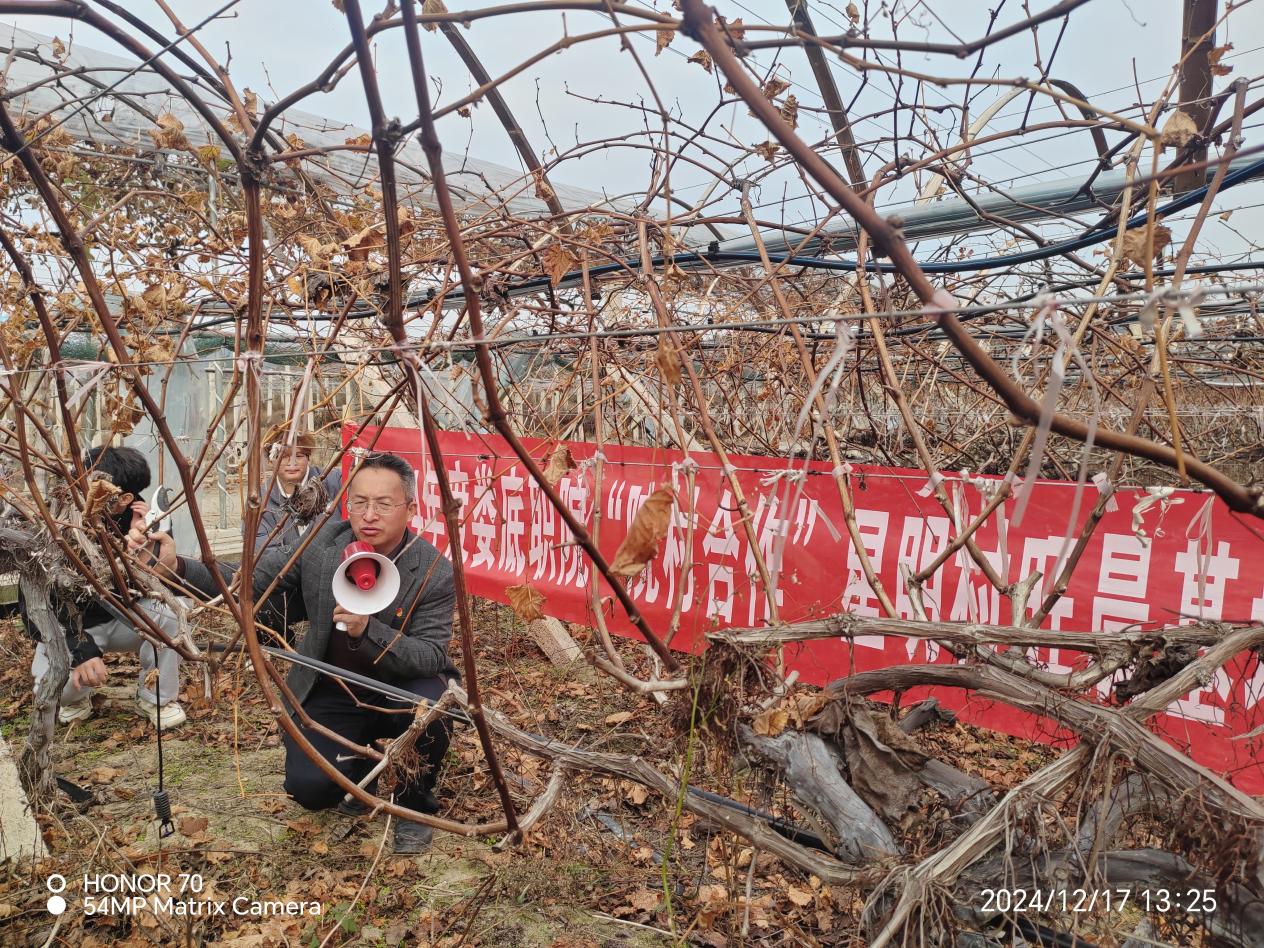 曾玉华教授、郭思宇老师凭借深厚的专业知识与娴熟的操作技能,在基地果园深入浅出地演示种植桑椹冬季修剪、葡萄秋施基肥等技术要点,张文泉教授、周晶老师则通过精彩的现场演示,全方位展示了“葡萄+黄精”立体种植及水肥一体化的先进技术。丰富多样的内容让师生们对现代农业种植技术有了更为深入和直观的理解。